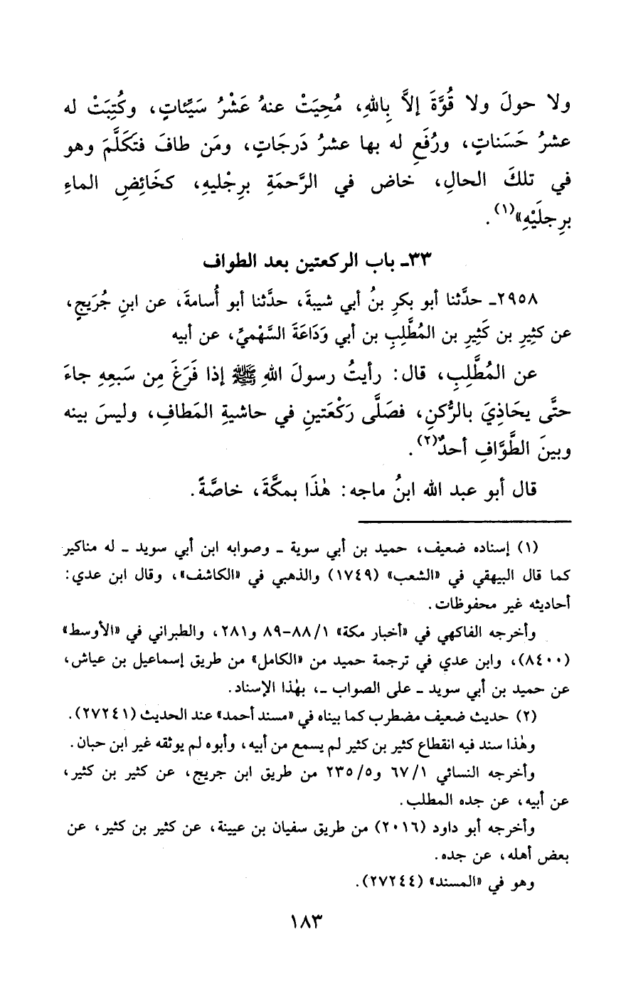 2958- حَدَّثَنَا أَبُو بَكْرِ بْنُ أَبِي شَيْبَةَ ، حَدَّثَنَا أَبُو أُسَامَةَ ، عَنِ ابْنِ جُرَيْجٍ ، عَنْ كَثِيرِ بْنِ كَثِيرِ بْنِ الْمُطَّلِبِ بْنِ أَبِي وَدَاعَةَ السَّهْمِيِّ ، عَنْ أَبِيهِ ، عَنِ الْمُطَّلِبِ ، قَالَ : رَأَيْتُ رَسُولَ اللهِ صَلَّى الله عَليْهِ وسَلَّمَ إِذَا فَرَغَ مِنْ سَبْعِهِ جَاءَ ، حَتَّى يُحَاذِيَ بِالرُّكْنِ ، فَصَلَّى رَكْعَتَيْنِ فِي حَاشِيَةِ الْمَطَافِ ، وَلَيْسَ بَيْنَهُ وَبَيْنَ الطُّوَّافِ أَحَدٌ.