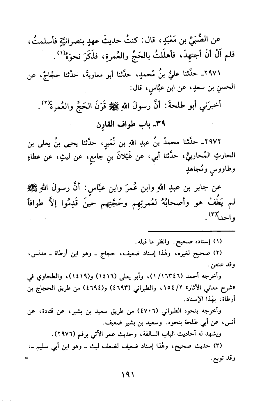 2972- حَدَّثَنَا مُحَمَّدُ بْنُ عَبْدِ اللهِ بْنِ نُمَيْرٍ ، حَدَّثَنَا يَحْيَى بْنُ يَعْلَى بْنِ حَارِثٍ الْمُحَارِبِيُّ ، حَدَّثَنَا أَبِي ، عَنْ غَيْلاَنَ بْنِ جَامِعٍ ، عَنْ لَيْثٍ ، عَنْ عَطَاءٍ ، وَطَاوُوسٍ ، وَمُجَاهِدٍ ، عَنْ جَابِرِ بْنِ عَبْدِ اللهِ ، وَابْنِ عُمَرَ وَابْنِ عَبَّاسٍ ، أَنَّ رَسُولَ اللهِ صَلَّى الله عَليْهِ وسَلَّمَ لَمْ يَطُفْ هُوَ وَأَصْحَابُهُ ، لِعُمْرَتِهِمْ وَحَجَّتِهِمْ ، حِينَ قَدِمُوا ، إِلاَّ طَوَافًا وَاحِدًا.