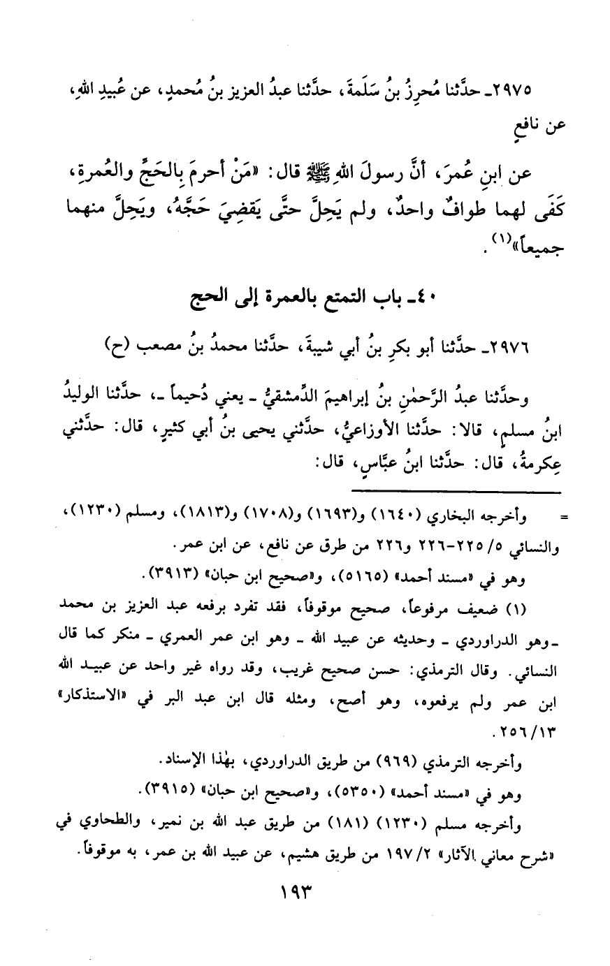 2976- حَدَّثَنَا أَبُو بَكْرِ بْنُ أَبِي شَيْبَةَ ، حَدَّثَنَا مُحَمَّدُ بْنُ مُصْعَبٍ (ح) وحَدَّثَنَا عَبْدُ الرَّحْمَنِ بْنُ إِبْرَاهِيمَ الدِّمَشْقِيُّ يَعْنِي دُحَيْمًا ، حَدَّثَنَا الْوَلِيدُ بْنُ مُسْلِمٍ ، قَالاَ : حَدَّثَنَا الأَوْزَاعِيُّ , حَدَّثَنِي يَحْيَى بْنُ أَبِي كَثِيرٍ , حَدَّثَنِي عِكْرِمَةُ ، حَدَّثَنَا ابْنُ عَبَّاسٍ , حَدَّثَنِي عُمَرُ بْنُ الْخَطَّابِ ، قَالَ : سَمِعْتُ رَسُولَ اللهِ صَلَّى الله عَليْهِ وسَلَّمَ يَقُولُ وَهُوَ بِالْعَقِيقِ : أَتَانِي آتٍ مِنْ رَبِّي ، فَقَالَ : صَلِّ فِي هَذَا الْوَادِي الْمُبَارَكِ ، وَقُلْ : عُمْرَةٌ فِي حَجَّةٍ.