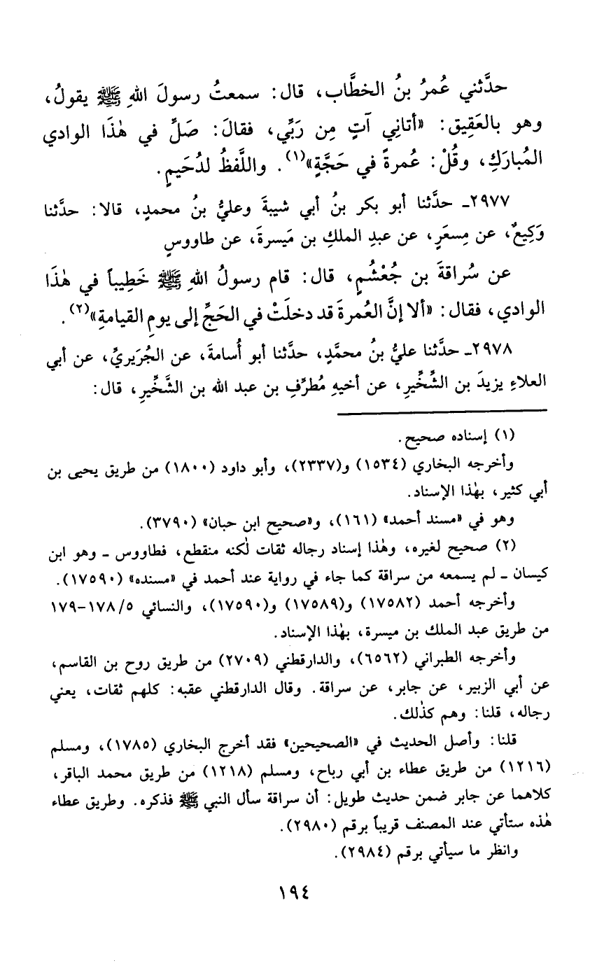 2977- حَدَّثَنَا أَبُو بَكْرِ بْنُ أَبِي شَيْبَةَ ، وَعَلِيُّ بْنُ مُحَمَّدٍ ، قَالاَ : حَدَّثَنَا وَكِيعٌ ، عَنْ مِسْعَرٍ ، عَنْ عَبْدِ الْمَلِكِ بْنِ مَيْسَرَةَ ، عَنْ طَاوُوسٍ ، عَنْ سُرَاقَةَ بْنِ جُعْشُمٍ ، قَالَ : قَامَ رَسُولُ اللهِ صَلَّى الله عَليْهِ وسَلَّمَ ، خَطِيبًا فِي هَذَا الْوَادِي ، فَقَالَ : أَلاَ إِنَّ الْعُمْرَةَ ، قَدْ دَخَلَتْ فِي الْحَجِّ ، إِلَى يَوْمِ الْقِيَامَةِ.