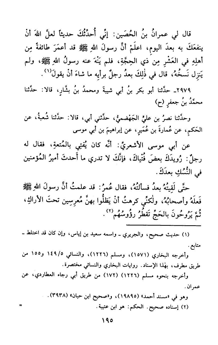 2979- حَدَّثَنَا أَبُو بَكْرِ بْنُ أَبِي شَيْبَةَ ، وَمُحَمَّدُ بْنُ بَشَّارٍ ، قَالاَ : حَدَّثَنَا مُحَمَّدُ بْنُ جَعْفَرٍ (ح) وحَدَّثَنَا نَصْرُ بْنُ عَلِيٍّ الْجَهْضَمِيُّ , حَدَّثَنِي أَبِي ، قَالاَ : حَدَّثَنَا شُعْبَةُ ، عَنِ الْحَكَمِ ، عَنْ عُمَارَةَ بْنِ عُمَيْرٍ ، عَنْ إِبْرَاهِيمَ بْنِ أَبِي مُوسَى ، عَنْ أَبِي مُوسَى الأَشْعَرِيِّ ، أَنَّهُ كَانَ يُفْتِي بِالْمُتْعَةِ ، فَقَالَ لَهُ رَجُلٌ : رُوَيْدَكَ بَعْضَ فُتْيَاكَ ، فَإِنَّكَ لاَ تَدْرِي ، مَا أَحْدَثَ أَمِيرُ الْمُؤْمِنِينَ فِي النُّسُكِ بَعْدَكَ.