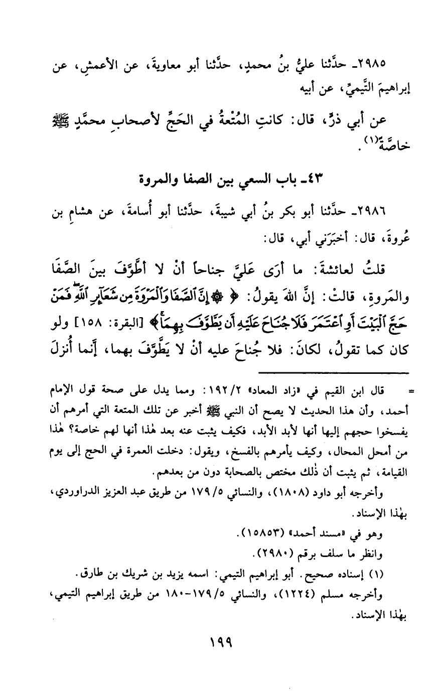 2986- حَدَّثَنَا أَبُو بَكْرِ بْنُ أَبِي شَيْبَةَ ، حَدَّثَنَا أَبُو أُسَامَةَ ، عَنْ هِشَامِ بْنِ عُرْوَةَ ، أَخْبَرَنِي أَبِي قَالَ : قُلْتُ لِعَائِشَةَ : مَا أَرَى عَلَيَّ جُنَاحًا ، أَنْ لاَ أَطَّوَّفَ بَيْنَ الصَّفَا وَالْمَرْوَةِ ، قَالَتْ : إِنَّ اللَّهَ يَقُولُ : {إِنَّ الصَّفَا وَالْمَرْوَةَ مِنْ شَعَائِرِ اللهِ ، فَمَنْ حَجَّ الْبَيْتَ ، أَوِ اعْتَمَرَ ، فَلاَ جُنَاحَ عَلَيْهِ أَنْ يَطَّوَّفَ بِهِمَا} وَلَوْ كَانَ كَمَا تَقُولُ : لَكَانَ فَلاَ جُنَاحَ عَلَيْهِ أَنْ ، لاَ يَطَّوَّفَ بِهِمَا ، إِنَّمَا أُنْزِلَ هَذَا فِي نَاسٍ مِنَ الأَنْصَارِ ، كَانُوا إِذَا أَهَلُّوا ، أَهَلُّوا لِمَنَاةَ ، فَلاَ يَحِلُّ لَهُمْ أَنْ يَطَّوَّفُوا بَيْنَ الصَّفَا وَالْمَرْوَةِ ، فَلَمَّا قَدِمُوا مَعَ النَّبِيِّ صَلَّى الله عَليْهِ وسَلَّمَ فِي الْحَجِّ ، ذَكَرُوا ذَلِكَ لَهُ ، فَأَنْزَلَهَا اللَّهُ ، فَلَعَمْرِي مَا أَتَمَّ اللَّهُ عَزَّ وَجَلَّ ، حَجَّ ، مَنْ لَمْ يَطُفْ بَيْنَ الصَّفَا ، وَالْمَرْوَةِ.