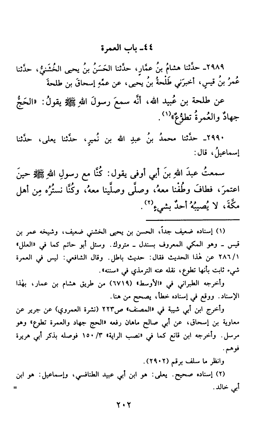 2989- حَدَّثَنَا هِشَامُ بْنُ عَمَّارٍ ، حَدَّثَنَا الْحَسَنُ بْنُ يَحْيَى الْخُشَنِيُّ ، حَدَّثَنَا عُمَرُ بْنُ قَيْسٍ ، أَخْبَرَنِي طَلْحَةُ بْنُ يَحْيَى ، عَنْ عَمِّهِ إِسْحَاقَ بْنِ طَلْحَةَ ، عَنْ طَلْحَةَ بْنِ عُبَيْدِ اللهِ ، أَنَّهُ سَمِعَ رَسُولَ اللهِ صَلَّى الله عَليْهِ وسَلَّمَ يَقُولُ : الْحَجُّ جِهَادٌ ، وَالْعُمْرَةُ تَطَوُّعٌ.