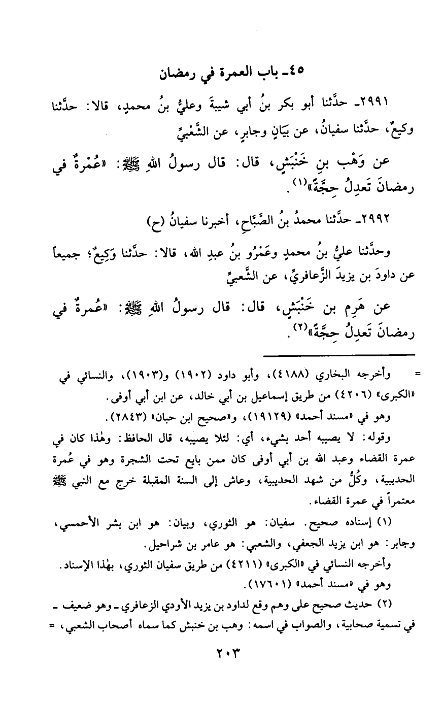 2992- حَدَّثَنَا مُحَمَّدُ بْنُ الصَّبَّاحِ ، حَدَّثَنَا سُفْيَانُ (ح) وحَدَّثَنَا عَلِيُّ بْنُ مُحَمَّدٍ ، وَعَمْرُو بْنُ عَبْدِ اللهِ ، قَالاَ : حَدَّثَنَا وَكِيعٌ ؛ جَمِيعًا عَنْ دَاوُدَ بْنِ يَزِيدَ الزَّعَافِرِيِّ ، عَنِ الشَّعْبِيِّ ، عَنْ هَرِمِ بْنِ خَنْبَشٍ ، قَالَ : قَالَ رَسُولُ اللهِ صَلَّى الله عَليْهِ وسَلَّمَ : عُمْرَةٌ فِي رَمَضَانَ ، تَعْدِلُ حَجَّةً.