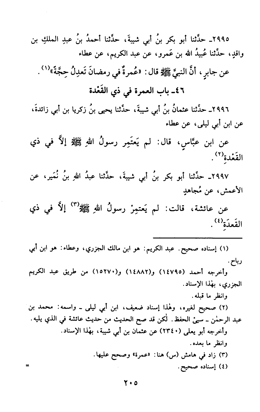 2996- حَدَّثَنَا عُثْمَانُ بْنُ أَبِي شَيْبَةَ ، حَدَّثَنَا يَحْيَى بْنُ زَكَرِيَّا بْنِ أَبِي زَائِدَةَ ، عَنِ ابْنِ أَبِي لَيْلَى ، عَنْ عَطَاءٍ ، عَنِ ابْنِ عَبَّاسٍ ، قَالَ : لَمْ يَعْتَمِرْ رَسُولُ اللهِ صَلَّى الله عَليْهِ وسَلَّمَ ، إِلاَّ فِي ذِي الْقَعْدَةِ.