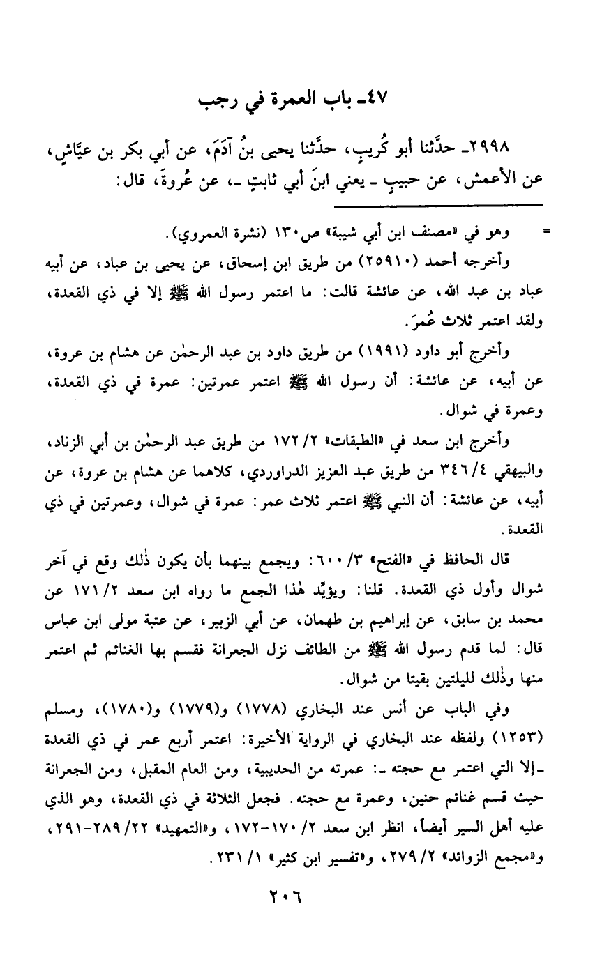 2998- حَدَّثَنَا أَبُو كُرَيْبٍ ، حَدَّثَنَا يَحْيَى بْنُ آدَمَ ، عَنْ أَبِي بَكْرِ بْنِ عَيَّاشٍ ، عَنِ الأَعْمَشِ ، عَنْ حَبِيبٍ , يَعْنِي ابْنَ أَبِي ثَابِتٍ ، عَنْ عُرْوَةَ ، قَالَ : سُئِلَ ابْنُ عُمَرَ فِي أَيِّ شَهْرٍ اعْتَمَرَ رَسُولُ اللهِ صَلَّى الله عَليْهِ وسَلَّمَ ؟ قَالَ : فِي رَجَبٍ فَقَالَتْ عَائِشَةُ : مَا اعْتَمَرَ رَسُولُ اللهِ صَلَّى الله عَليْهِ وسَلَّمَ فِي رَجَبٍ قَطُّ ، وَمَا اعْتَمَرَ إِلاَّ وَهُوَ مَعَهُ , تَعْنِي ابْنَ عُمَرَ.