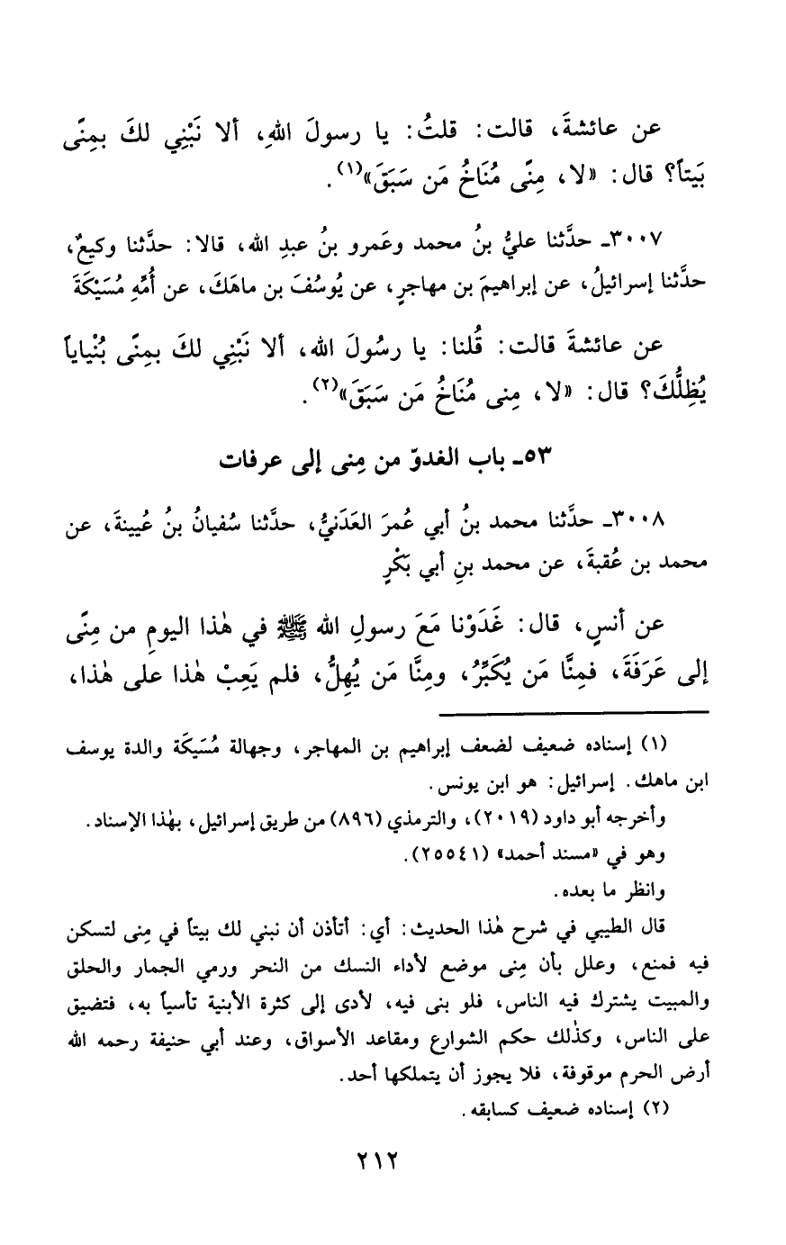 3007- حَدَّثَنَا عَلِيُّ بْنُ مُحَمَّدٍ ، وَعَمْرُو بْنُ عَبْدِ اللهِ ، قَالاَ : حَدَّثَنَا وَكِيعٌ ، عَنْ إِسْرَائِيلَ ، عَنْ إِبْرَاهِيمَ بْنِ مُهَاجِرٍ ، عَنْ يُوسُفَ بْنِ مَاهَكَ ، عَنْ أُمِّهِ مُسَيْكَةَ ، عَنْ عَائِشَةَ ، قَالَتْ : قُلْنَا : يَا رَسُولَ اللهِ ، أَلاَ نَبْنِي لَكَ بِمِنًى بَيْتًا يُظِلُّكَ ؟ قَالَ : لاَ , مِنًى مُنَاخُ مَنْ سَبَقَ.
