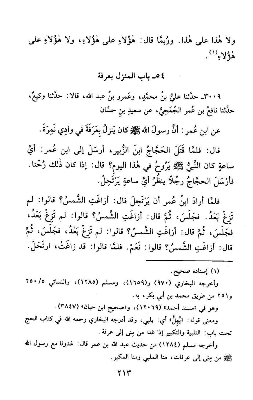 3009- حَدَّثَنَا عَلِيُّ بْنُ مُحَمَّدٍ ، وَعَمْرُو بْنُ عَبْدِ اللهِ ، قَالاَ : حَدَّثَنَا وَكِيعٌ ، أَخْبَرَنَا نَافِعُ بْنُ عُمَرَ الْجُمَحِيُّ ، عَنْ سَعِيدِ بْنِ حَسَّانَ ، عَنِ ابْنِ عُمَرَ ، أَنَّ رَسُولَ اللهِ صَلَّى الله عَليْهِ وسَلَّمَ كَانَ يَنْزِلُ بِعَرَفَةَ فِي وَادِي نَمِرَةَ.