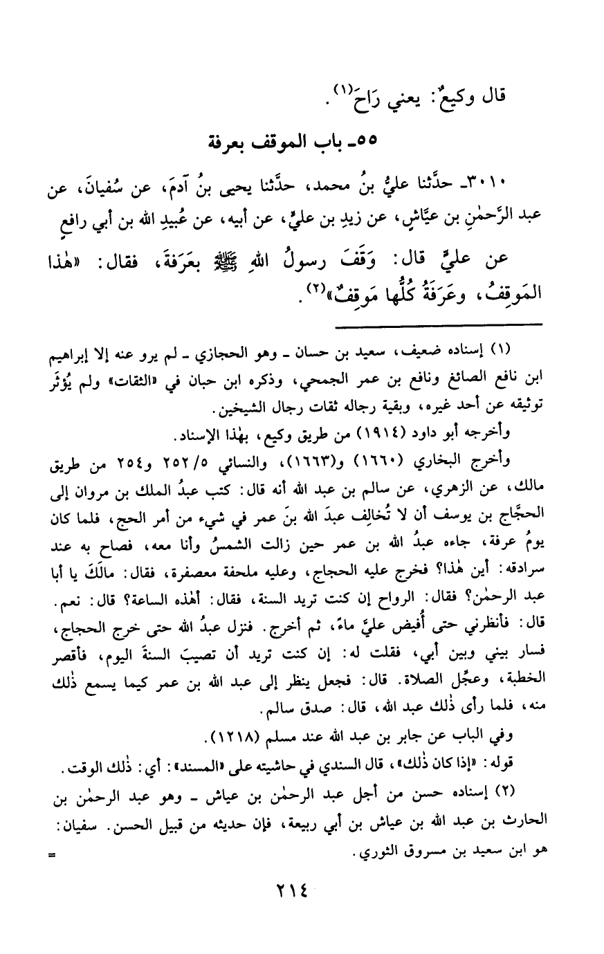 3010- حَدَّثَنَا عَلِيُّ بْنُ مُحَمَّدٍ ، حَدَّثَنَا يَحْيَى بْنُ آدَمَ ، عَنْ سُفْيَانَ ، عَنْ عَبْدِ الرَّحْمَنِ بْنِ عَيَّاشٍ ، عَنْ زَيْدِ بْنِ عَلِيٍّ ، عَنْ أَبِيهِ ، عَنْ عُبَيْدِ اللهِ بْنِ أَبِي رَافِعٍ ، عَنْ عَلِيٍّ ، قَالَ : وَقَفَ رَسُولُ اللهِ صَلَّى الله عَليْهِ وسَلَّمَ بِعَرَفَةَ ، فَقَالَ : هَذَا الْمَوْقِفُ ، وَعَرَفَةُ كُلُّهَا مَوْقِفٌ.