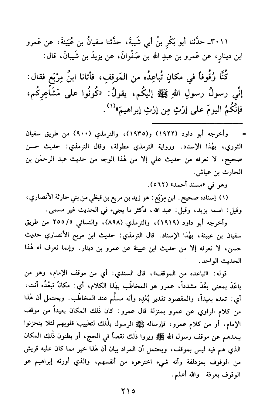 3011- حَدَّثَنَا أَبُو بَكْرِ بْنُ أَبِي شَيْبَةَ ، حَدَّثَنَا سُفْيَانُ بْنُ عُيَيْنَةَ ، عَنْ عَمْرِو بْنِ دِينَارٍ ، عَنْ عَمْرِو بْنِ عَبْدِ اللهِ بْنِ صَفْوَانَ ، عَنْ يَزِيدَ بْنِ شَيْبَانَ ، قَالَ : كُنَّا وُقُوفًا فِي مَكَانٍ تُبَاعِدُهُ مِنَ الْمَوْقِفِ ، فَأَتَانَا ابْنُ مِرْبَعٍ فَقَالَ : إِنِّي رَسُولُ رَسُولِ اللهِ صَلَّى الله عَليْهِ وسَلَّمَ إِلَيْكُمْ يَقُولُ : كُونُوا عَلَى مَشَاعِرِكُمْ ، فَإِنَّكُمُ الْيَوْمَ عَلَى إِرْثٍ ، مِنْ إِرْثِ إِبْرَاهِيمَ.