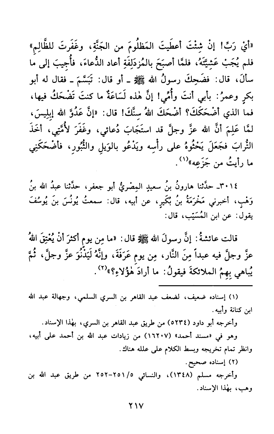 3014- حَدَّثَنَا هَارُونُ بْنُ سَعِيدٍ الْمِصْرِيُّ أَبُو جَعْفَرٍ ، حَدَّثَنَا عَبْدُ اللهِ بْنُ وَهْبٍ ، أَخْبَرَنِي مَخْرَمَةُ بْنُ بُكَيْرٍ ، عَنْ أَبِيهِ ، قَالَ : سَمِعْتُ يُونُسَ بْنَ يُوسُفَ ، يَقُولُ : عَنِ ابْنِ الْمُسَيَّبِ ، قَالَ : قَالَتْ عَائِشَةُ : إِنَّ رَسُولَ اللهِ صَلَّى الله عَليْهِ وسَلَّمَ قَالَ : مَا مِنْ يَوْمٍ أَكْثَرَ مِنْ ، أَنْ يُعْتِقَ اللَّهُ عَزَّ وَجَلَّ فِيهِ ، عَبْدًا مِنَ النَّارِ ، مِنْ يَوْمِ عَرَفَةَ ، وَإِنَّهُ لَيَدْنُو عَزَّ وَجَلَّ ، ثُمَّ يُبَاهِي بِهِمُ الْمَلاَئِكَةَ ، فَيَقُولُ : مَا أَرَادَ هَؤُلاَءِ.