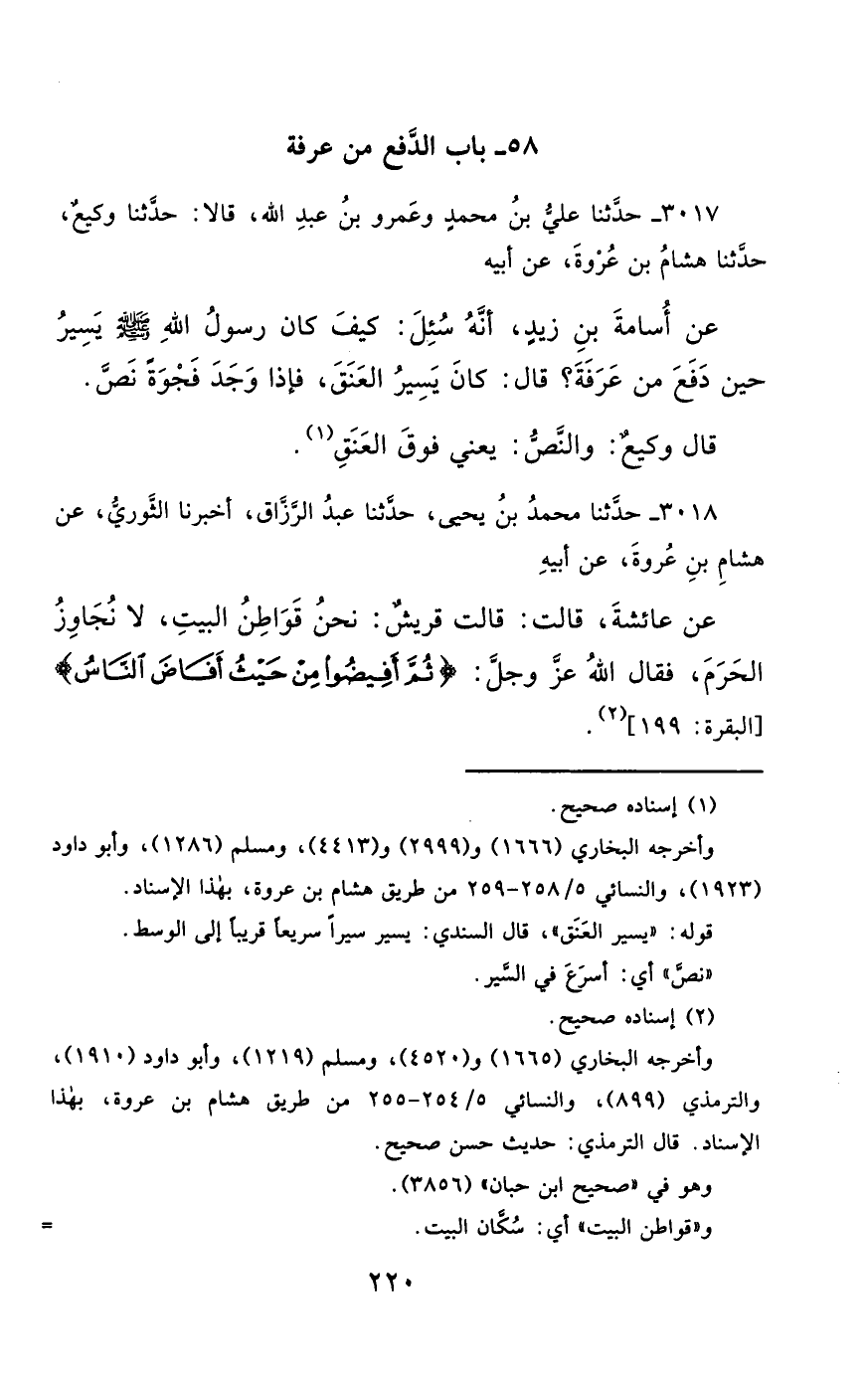 3017- حَدَّثَنَا عَلِيُّ بْنُ مُحَمَّدٍ ، وَعَمْرُو بْنُ عَبْدِ اللهِ ، قَالاَ : حَدَّثَنَا وَكِيعٌ ، حَدَّثَنَا هِشَامُ بْنُ عُرْوَةَ ، عَنْ أَبِيهِ ، عَنْ أُسَامَةَ بْنِ زَيْدٍ ، أَنَّهُ سُئِلَ : كَيْفَ كَانَ رَسُولُ اللهِ صَلَّى الله عَليْهِ وسَلَّمَ يَسِيرُ حِينَ دَفَعَ مِنْ عَرَفَةَ ؟ قَالَ : كَانَ يَسِيرُ الْعَنَقَ ، فَإِذَا وَجَدَ فَجْوَةً ، نَصَّ.
