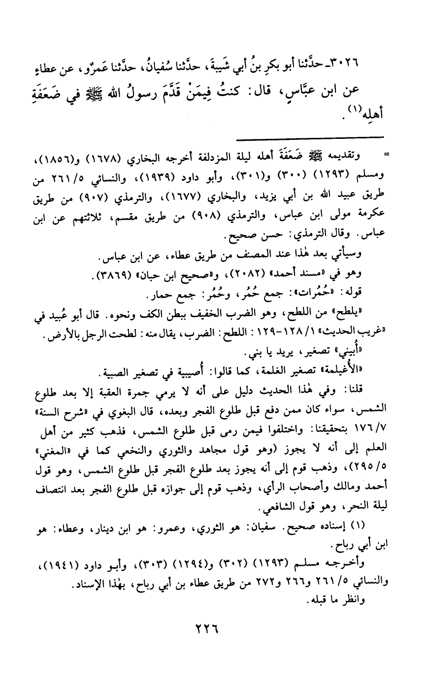 3026- حَدَّثَنَا أَبُو بَكْرِ بْنُ أَبِي شَيْبَةَ ، حَدَّثَنَا سُفْيَانُ ، حَدَّثَنَا عَمْرٌو ، عَنْ عَطَاءٍ ، عَنِ ابْنِ عَبَّاسٍ قَالَ : كُنْتُ فِيمَنْ قَدِمَ رَسُولَ اللهِ صَلَّى الله عَليْهِ وسَلَّمَ فِي ضَعَفَةِ أَهْلِهِ.