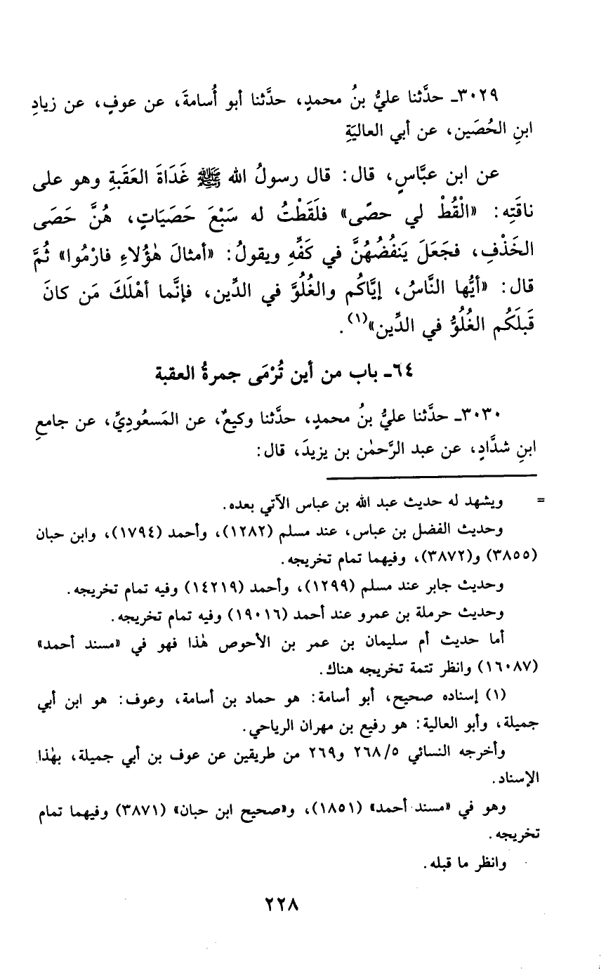3029- حَدَّثَنَا عَلِيُّ بْنُ مُحَمَّدٍ ، حَدَّثَنَا أَبُو أُسَامَةَ ، عَنْ عَوْفٍ ، عَنْ زِيَادِ بْنِ الْحُصَيْنِ ، عَنْ أَبِي الْعَالِيَةِ ، عَنِ ابْنِ عَبَّاسٍ ، قَالَ : قَالَ رَسُولُ اللهِ صَلَّى الله عَليْهِ وسَلَّمَ : غَدَاةَ الْعَقَبَةِ وَهُوَ عَلَى نَاقَتِهِ الْقُطْ لِي حَصًى فَلَقَطْتُ لَهُ سَبْعَ حَصَيَاتٍ ، هُنَّ حَصَى الْخَذْفِ ، فَجَعَلَ يَنْفُضُهُنَّ فِي كَفِّهِ وَيَقُولُ أَمْثَالَ هَؤُلاَءِ ، فَارْمُوا ثُمَّ قَالَ : يَا أَيُّهَا النَّاسُ إِيَّاكُمْ وَالْغُلُوَّ فِي الدِّينِ ، فَإِنَّمَا أَهْلَكَ مَنْ كَانَ قَبْلَكُمُ الْغُلُوُّ فِي الدِّينِ.