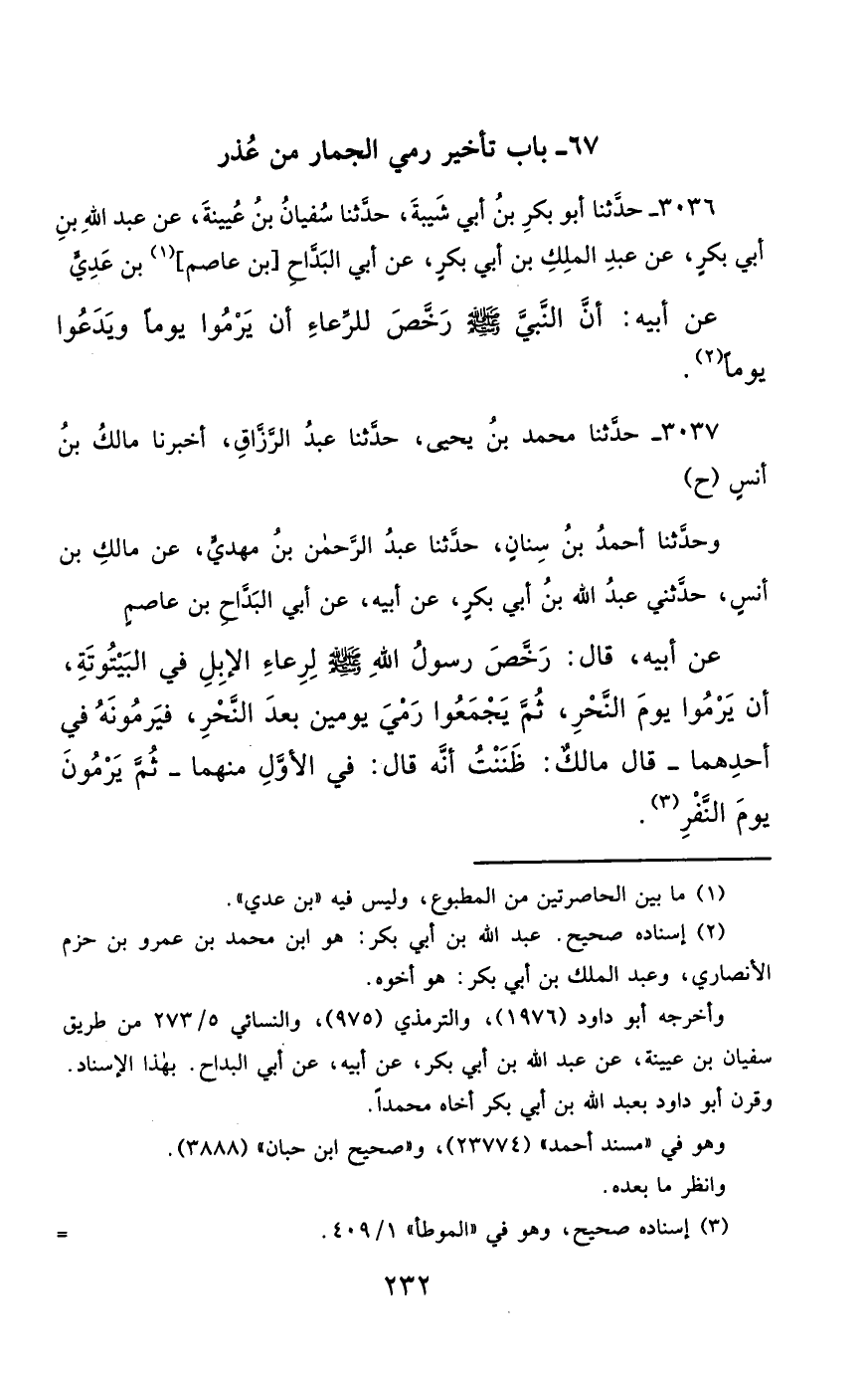 3037- حَدَّثَنَا مُحَمَّدُ بْنُ يَحْيَى ، حَدَّثَنَا عَبْدُ الرَّزَّاقِ ، أَخْبَرَنَا مَالِكُ بْنُ أَنَسٍ (ح) وحَدَّثَنَا أَحْمَدُ بْنُ سِنَانٍ ، حَدَّثَنَا عَبْدُ الرَّحْمَنِ بْنُ مَهْدِيٍّ ، عَنْ مَالِكِ بْنِ أَنَسٍ ، حَدَّثَنِي عَبْدُ اللهِ بْنُ أَبِي بَكْرٍ ، عَنْ أَبِيهِ ، عَنْ أَبِي الْبَدَّاحِ بْنِ عَاصِمٍ ، عَنْ أَبِيهِ ، قَالَ : رَخَّصَ رَسُولُ اللهِ صَلَّى الله عَليْهِ وسَلَّمَ لِرِعَاءِ الإِبِلِ فِي الْبَيْتُوتَةِ ، أَنْ يَرْمُوا يَوْمَ النَّحْرِ ، ثُمَّ يَجْمَعُوا رَمْيَ يَوْمَيْنِ بَعْدَ النَّحْرِ ، فَيَرْمُونَهُ فِي أَحَدِهِمَا.