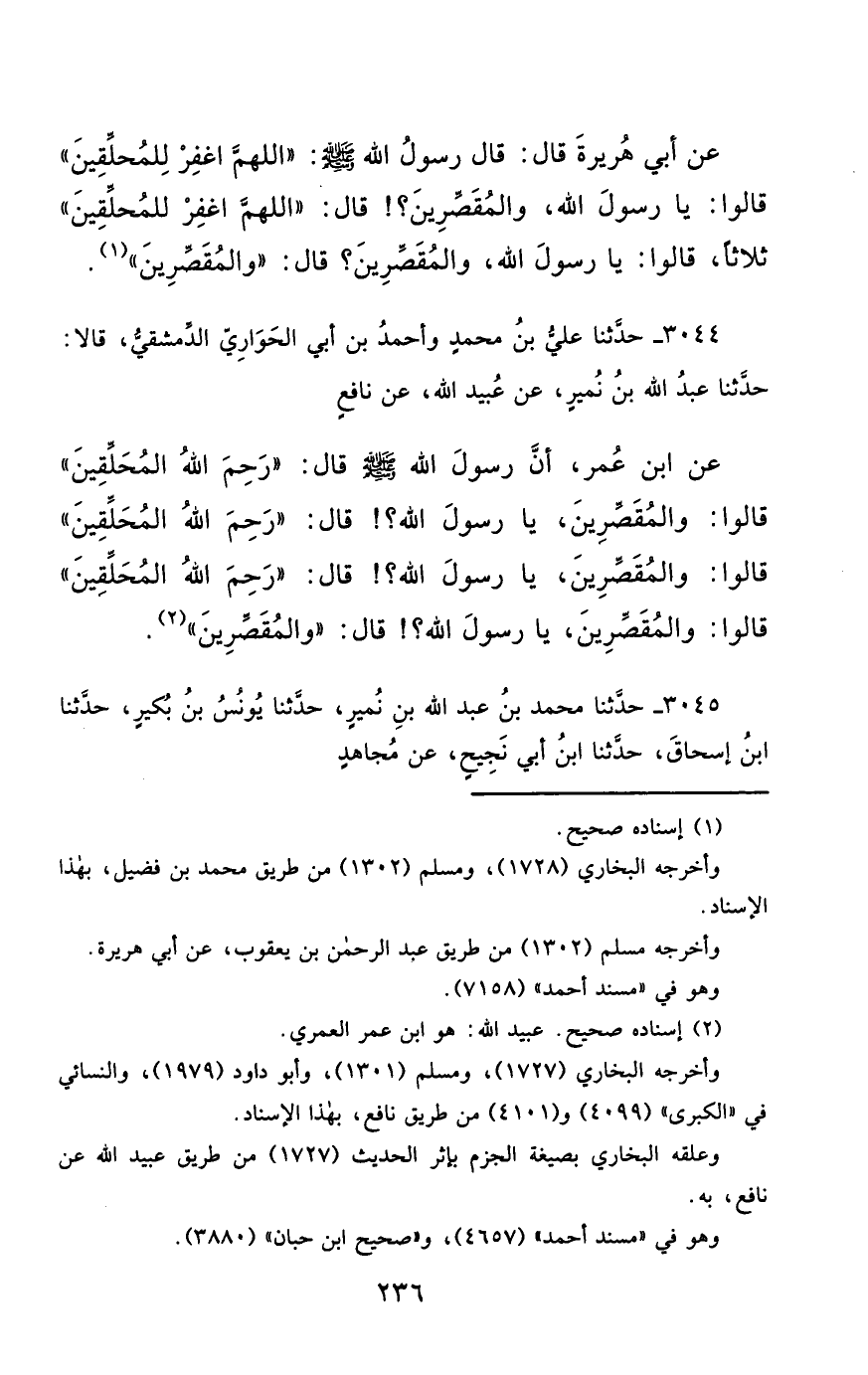3044- حَدَّثَنَا عَلِيُّ بْنُ مُحَمَّدٍ ، وَأَحْمَدُ بْنُ أَبِي الْحَوَارِيِّ الدِّمَشْقِيُّ ، قَالاَ : حَدَّثَنَا عَبْدُ اللهِ بْنُ نُمَيْرٍ ، عَنْ عُبَيْدِ اللهِ ، عَنْ نَافِعٍ ، عَنِ ابْنِ عُمَرَ ، أَنَّ رَسُولَ اللهِ صَلَّى الله عَليْهِ وسَلَّمَ قَالَ : رَحِمَ اللَّهُ الْمُحَلِّقِينَ قَالُوا : وَالْمُقَصِّرِينَ يَا رَسُولَ اللهِ ؟ قَالَ : رَحِمَ اللَّهُ الْمُحَلِّقِينَ قَالُوا : وَالْمُقَصِّرِينَ يَا رَسُولَ اللهِ ؟ قَالَ : رَحِمَ اللَّهُ الْمُحَلِّقِينَ قَالُوا : وَالْمُقَصِّرِينَ يَا رَسُولَ اللهِ ؟ قَالَ : وَالْمُقَصِّرِينَ.