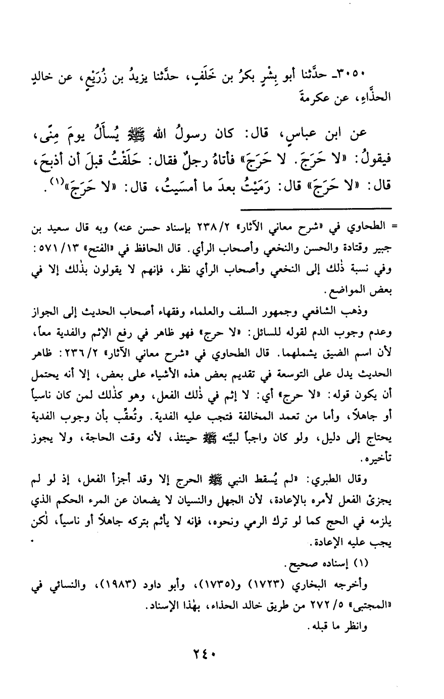 3050- حَدَّثَنَا أَبُو بِشْرٍ بَكْرُ بْنُ خَلَفٍ ، حَدَّثَنَا يَزِيدُ بْنُ زُرَيْعٍ ، عَنْ خَالِدٍ الْحَذَّاءِ ، عَنْ عِكْرِمَةَ ، عَنِ ابْنِ عَبَّاسٍ ، قَالَ : كَانَ رَسُولُ اللهِ صَلَّى الله عَليْهِ وسَلَّمَ يُسْأَلُ يَوْمَ مِنًى فَيَقُولُ : لاَ حَرَجَ ، لاَ حَرَجَ فَأَتَاهُ رَجُلٌ فَقَالَ : حَلَقْتُ قَبْلَ أَنْ أَذْبَحَ ، قَالَ : لاَ حَرَجَ قَالَ : رَمَيْتُ بَعْدَ مَا أَمْسَيْتُ قَالَ : لاَ حَرَجَ.