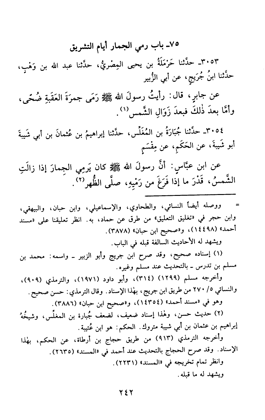 3053- حَدَّثَنَا حَرْمَلَةُ بْنُ يَحْيَى الْمِصْرِيُّ ، حَدَّثَنَا عَبْدُ اللهِ بْنُ وَهْبٍ ، حَدَّثَنَا ابْنُ جُرَيْجٍ ، عَنْ أَبِي الزُّبَيْرِ ، عَنْ جَابِرٍ ، قَالَ : رَأَيْتُ رَسُولَ اللهِ صَلَّى الله عَليْهِ وسَلَّمَ رَمَى جَمْرَةَ الْعَقَبَةِ ضُحًى ، وَأَمَّا بَعْدَ ذَلِكَ ، فَبَعْدَ زَوَالِ الشَّمْسِ.