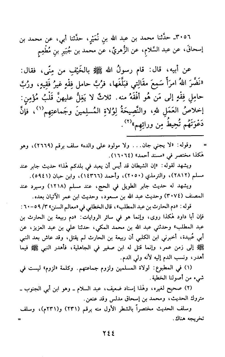 3056- حَدَّثَنَا مُحَمَّدُ بْنُ عَبْدِ اللهِ بْنِ نُمَيْرٍ ، حَدَّثَنَا أَبِي ، عَنْ مُحَمَّدِ بْنِ إِسْحَاقَ ، عَنْ عَبْدِ السَّلاَمِ ، عَنِ الزُّهْرِيِّ ، عَنْ مُحَمَّدِ بْنِ جُبَيْرِ بْنِ مُطْعِمٍ ، عَنْ أَبِيهِ ، قَالَ : قَامَ رَسُولُ اللهِ صَلَّى الله عَليْهِ وسَلَّمَ بِالْخَيْفِ مِنْ مِنًى ، فَقَالَ : نَضَّرَ اللَّهُ امْرَءًا سَمِعَ مَقَالَتِي ، فَبَلَّغَهَا ، فَرُبَّ حَامِلِ فِقْهٍ ، غَيْرُ فَقِيهٍ ، وَرُبَّ حَامِلِ فِقْهٍ إِلَى مَنْ هُوَ أَفْقَهُ مِنْهُ ، ثَلاَثٌ لاَ يُغِلُّ عَلَيْهِنَّ قَلْبُ مُؤْمِنٍ : إِخْلاَصُ الْعَمَلِ لِلَّهِ ، وَالنَّصِيحَةُ لِوُلاَةِ الْمُسْلِمِينَ ، وَلُزُومُ جَمَاعَتِهِمْ ، فَإِنَّ دَعْوَتَهُمْ ، تُحِيطُ مِنْ وَرَائِهِمْ.
