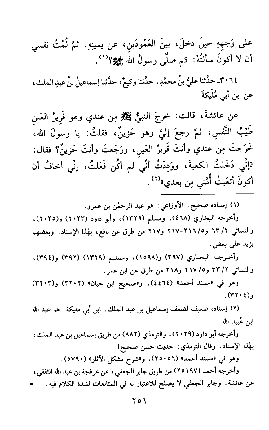 3064- حَدَّثَنَا عَلِيُّ بْنُ مُحَمَّدٍ ، حَدَّثَنَا وَكِيعٌ ، حَدَّثَنَا إِسْمَاعِيلُ بْنُ عَبْدِ الْمَلِكِ ، عَنِ ابْنِ أَبِي مُلَيْكَةَ ، عَنْ عَائِشَةَ ، قَالَتْ : خَرَجَ النَّبِيُّ صَلَّى الله عَليْهِ وسَلَّمَ مِنْ عِنْدِي ، وَهُوَ قَرِيرُ الْعَيْنِ ، طَيِّبُ النَّفْسِ ، ثُمَّ رَجَعَ إِلَيَّ وَهُوَ حَزِينٌ ، فَقُلْتُ : يَا رَسُولَ اللهِ ، خَرَجْتَ مِنْ عِنْدِي ، وَأَنْتَ قَرِيرُ الْعَيْنِ ، وَرَجَعْتَ وَأَنْتَ حَزِينٌ ؟ فَقَالَ : إِنِّي دَخَلْتُ الْكَعْبَةَ ، وَوَدِدْتُ أَنِّي لَمْ أَكُنْ فَعَلْتُ ، إِنِّي أَخَافُ أَنْ أَكُونَ ، أَتْعَبْتُ أُمَّتِي مِنْ بَعْدِي.
