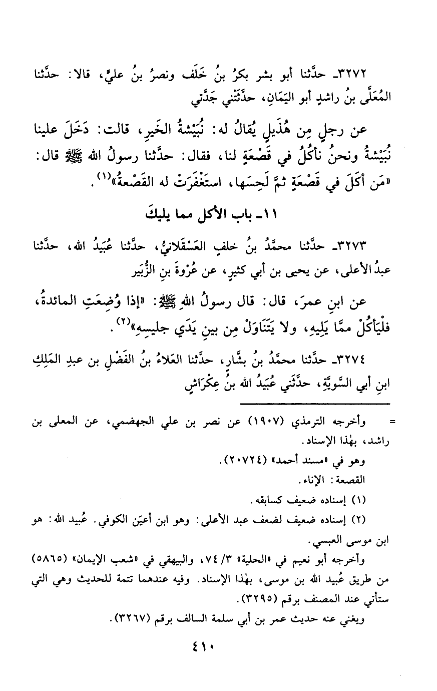 3272- حَدَّثَنَا أَبُو بِشْرٍ بَكْرُ بْنُ خَلَفٍ ، وَنَصْرُ بْنُ عَلِيٍّ ، قَالاَ : حَدَّثَنَا الْمُعَلَّى بْنُ رَاشِدٍ أَبُو الْيَمَانِ قَالَ : حَدَّثَتْنِي جَدَّتِي ، عَنْ رَجُلٍ مِنْ هُذَيْلٍ ، يُقَالُ لَهُ : نُبَيْشَةُ الْخَيْرِ ، قَالَتْ : دَخَلَ عَلَيْنَا نُبَيْشَةُ ، وَنَحْنُ نَأْكُلُ فِي قَصْعَةٍ لَنَا ، فَحَدَّثَنَا رَسُولُ اللهِ صَلَّى الله عَليْهِ وسَلَّمَ قَالَ : مَنْ أَكَلَ فِي قَصْعَةٍ ثُمَّ لَحِسَهَا اسْتَغْفَرَتْ لَهُ الْقَصْعَةُ.
