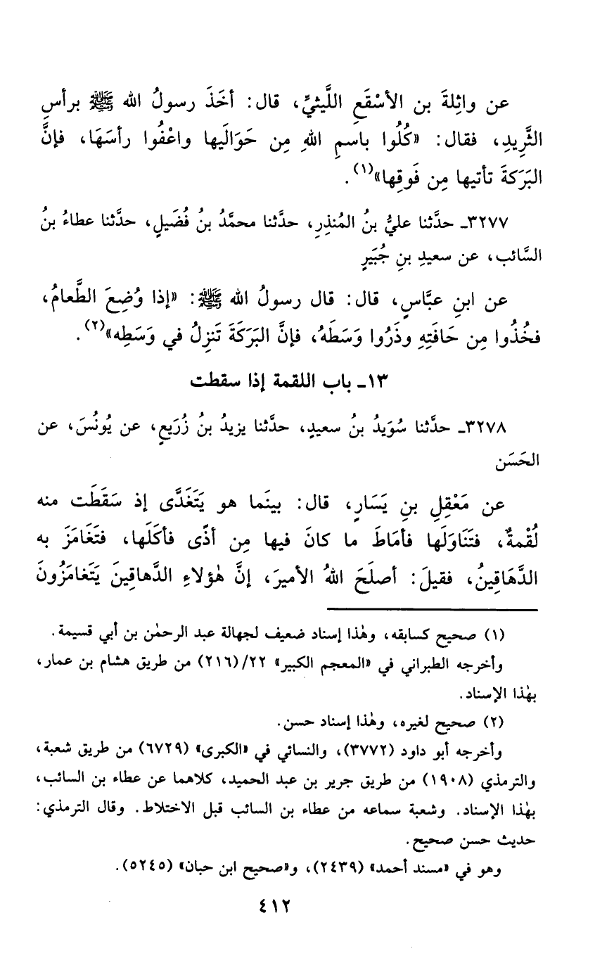 3278- حَدَّثَنَا سُوَيْدُ بْنُ سَعِيدٍ ، حَدَّثَنَا يَزِيدُ بْنُ زُرَيْعٍ ، عَنْ يُونُسَ ، عَنِ الْحَسَنِ ، عَنْ مَعْقِلِ بْنِ يَسَارٍ ، قَالَ : بَيْنَمَا هُوَ يَتَغَدَّى ، إِذْ سَقَطَتْ مِنْهُ لُقْمَةٌ ، فَتَنَاوَلَهَا ، فَأَمَاطَ ، مَا كَانَ فِيهَا مِنْ أَذًى ، فَأَكَلَهَا ، فَتَغَامَزَ بِهِ الدَّهَاقِينُ ، فَقِيلَ : أَصْلَحَ اللَّهُ الأَمِيرَ ، إِنَّ هَؤُلاَءِ الدَّهَاقِينَ يَتَغَامَزُونَ ، مِنْ أَخْذِكَ اللُّقْمَةَ ، وَبَيْنَ يَدَيْكَ هَذَا الطَّعَامُ ، قَالَ : إِنِّي لَمْ أَكُنْ لأَدَعَ ، مَا سَمِعْتُ مِنْ رَسُولِ اللهِ صَلَّى الله عَليْهِ وسَلَّمَ لِهَذِهِ الأَعَاجِمِ : إِنَّا كُنَّا يُؤْمَرُ أَحَدُنَا ، إِذَا سَقَطَتْ لُقْمَتُهُ ، أَنْ يَأْخُذَهَا ، فَيُمِيطَ ، مَا كَانَ فِيهَا مِنْ أَذًى وَيَأْكُلَهَا ، وَلاَ يَدَعَهَا لِلشَّيْطَانِ.