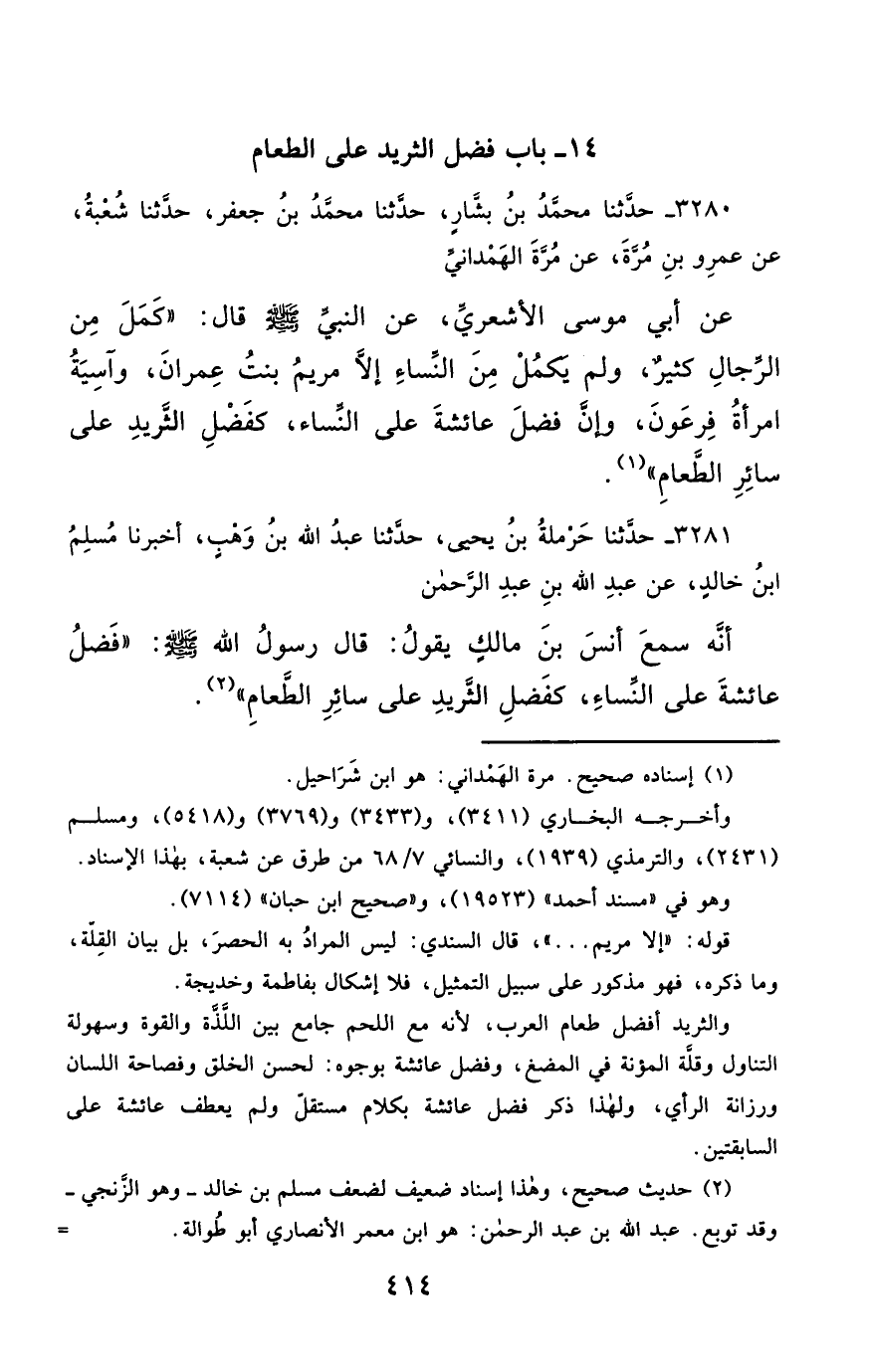 3281- حَدَّثَنَا حَرْمَلَةُ بْنُ يَحْيَى ، حَدَّثَنَا عَبْدُ اللهِ بْنُ وَهْبٍ ، أَخْبَرَنَا مُسْلِمُ بْنُ خَالِدٍ ، عَنْ عَبْدِ اللهِ بْنِ عَبْدِ الرَّحْمَنِ ، أَنَّهُ سَمِعَ أَنَسَ بْنَ مَالِكٍ ، يَقُولُ : قَالَ رَسُولُ اللهِ صَلَّى الله عَليْهِ وسَلَّمَ : فَضْلُ عَائِشَةَ عَلَى النِّسَاءِ ، كَفَضْلِ الثَّرِيدِ عَلَى سَائِرِ الطَّعَامِ.
