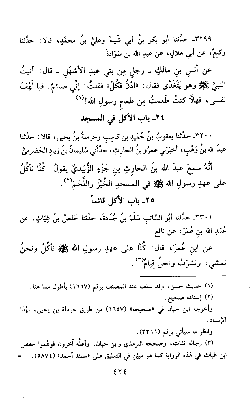 3301- حَدَّثَنَا أَبُو السَّائِبِ سَلْمُ بْنُ جُنَادَةَ ، حَدَّثَنَا حَفْصُ بْنُ غِيَاثٍ ، عَنْ عُبَيْدِ اللهِ بْنِ عُمَرَ ، عَنْ نَافِعٍ ، عَنِ ابْنِ عُمَرَ ، قَالَ : كُنَّا عَلَى عَهْدِ رَسُولِ اللهِ صَلَّى الله عَليْهِ وسَلَّمَ : نَأْكُلُ وَنَحْنُ نَمْشِي ، وَنَشْرَبُ ، وَنَحْنُ قِيَامٌ.
