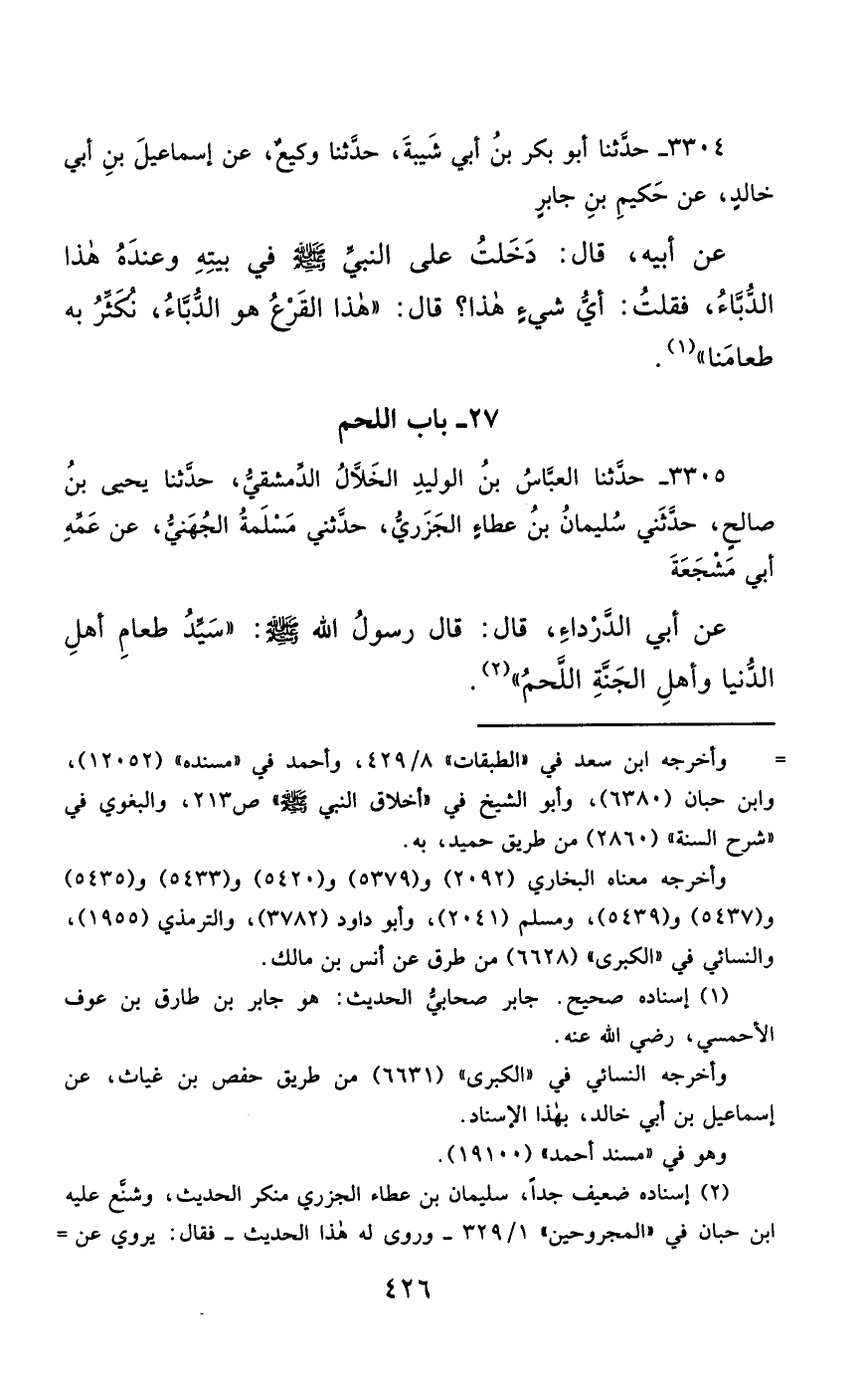 3305- حَدَّثَنَا الْعَبَّاسُ بْنُ الْوَلِيدِ الْخَلاَّلُ الدِّمَشْقِيُّ ، حَدَّثَنَا يَحْيَى بْنُ صَالِحٍ , حَدَّثَنِي سُلَيْمَانُ بْنُ عَطَاءٍ الْجَزَرِيُّ , حَدَّثَنِي مَسْلَمَةُ بْنُ عَبْدِ اللهِ الْجُهَنِيُّ ، عَنْ عَمِّهِ أَبِي مَشْجَعَةَ ، عَنْ أَبِي الدَّرْدَاءِ ، قَالَ : قَالَ رَسُولُ اللهِ صَلَّى الله عَليْهِ وسَلَّمَ : سَيِّدُ طَعَامِ أَهْلِ الدُّنْيَا ، وَأَهْلِ الْجَنَّةِ اللَّحْمُ.