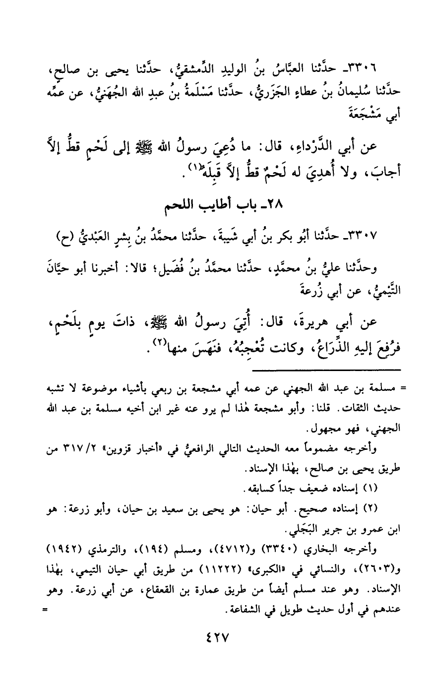 3306- حَدَّثَنَا الْعَبَّاسُ بْنُ الْوَلِيدِ الدِّمَشْقِيُّ ، حَدَّثَنَا يَحْيَى بْنُ صَالِحٍ ، حَدَّثَنَا سُلَيْمَانُ بْنُ عَطَاءٍ الْجَزَرِيُّ ، حَدَّثَنَا مَسْلَمَةُ بْنُ عَبْدِ اللهِ الْجُهَنِيُّ ، عَنْ عَمِّهِ أَبِي مَشْجَعَةَ ، عَنْ أَبِي الدَّرْدَاءِ ، قَالَ : مَا دُعِيَ رَسُولُ اللهِ صَلَّى الله عَليْهِ وسَلَّمَ ، إِلَى لَحْمٍ قَطُّ ، إِلاَّ أَجَابَ ، وَلاَ أُهْدِيَ لَهُ لَحْمٌ قَطُّ ، إِلاَّ قِبَلَهُ.