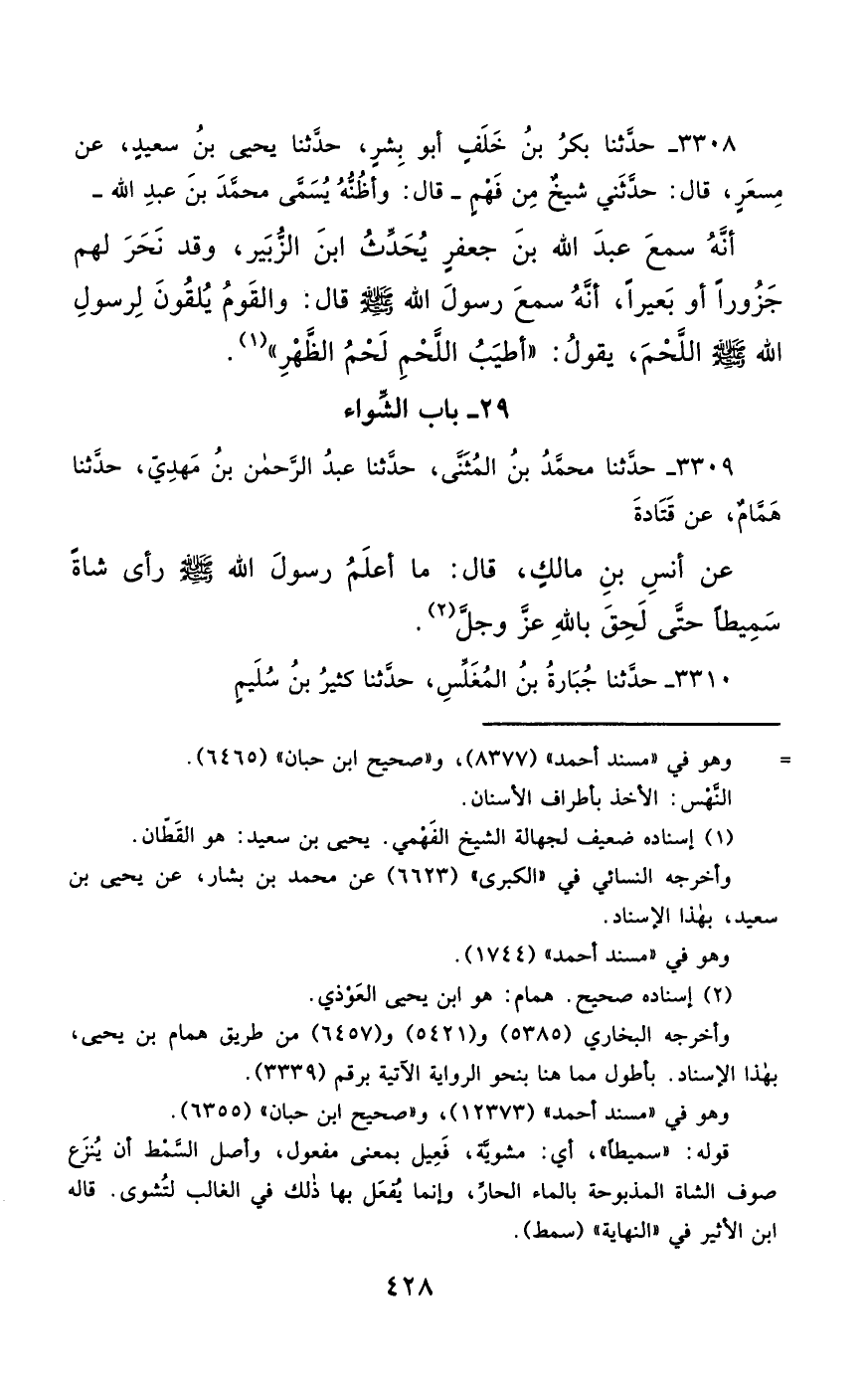 3308- حَدَّثَنَا بَكْرُ بْنُ خَلَفٍ أَبُو بِشْرٍ ، حَدَّثَنَا يَحْيَى بْنُ سَعِيدٍ ، عَنْ مِسْعَرٍ , حَدَّثَنِي شَيْخٌ ، مِنْ فَهْمٍ قَالَ : وَأَظُنُّهُ يُسَمَّى مُحَمَّدَ بْنَ عَبْدِ اللهِ ، أَنَّهُ سَمِعَ عَبْدَ اللهِ بْنَ جَعْفَرٍ ، يُحَدِّثُ ابْنَ الزُّبَيْرِ ، وَقَدْ نَحَرَ لَهُمْ جَزُورًا ، أَوْ بَعِيرًا أَنَّهُ سَمِعَ رَسُولَ اللهِ صَلَّى الله عَليْهِ وسَلَّمَ قَالَ : وَالْقَوْمُ يُلْقُونَ لِرَسُولِ اللهِ صَلَّى الله عَليْهِ وسَلَّمَ اللَّحْمَ يَقُولُ : أَطْيَبُ اللَّحْمِ ، لَحْمُ الظَّهْرِ.