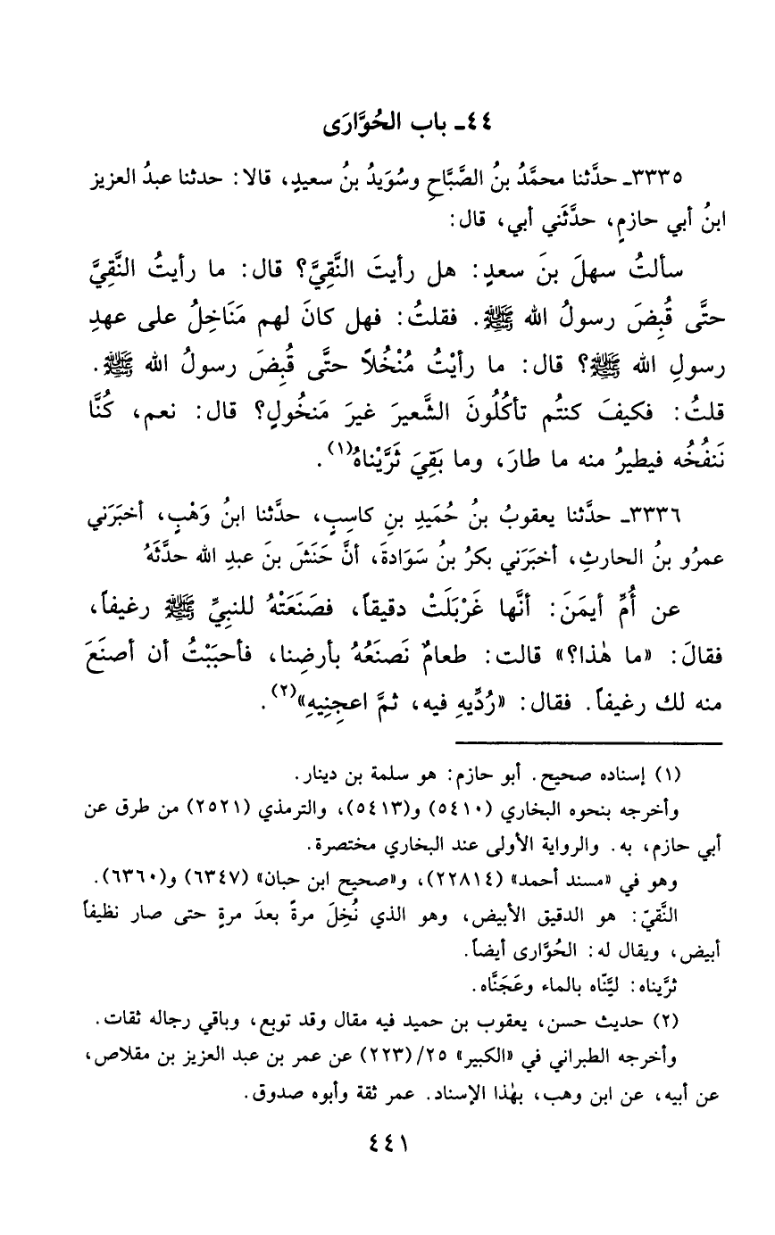3335- حَدَّثَنَا مُحَمَّدُ بْنُ الصَّبَّاحِ ، وَسُوَيْدُ بْنُ سَعِيدٍ ، قَالاَ : حَدَّثَنَا عَبْدُ الْعَزِيزِ بْنُ أَبِي حَازِمٍ , حَدَّثَنِي أَبِي ، قَالَ : سَأَلْتُ سَهْلَ بْنَ سَعْدٍ : هَلْ رَأَيْتَ النَّقِيَّ ؟ قَالَ : مَا رَأَيْتُ النَّقِيَّ ، حَتَّى قُبِضَ رَسُولُ اللهِ صَلَّى الله عَليْهِ وسَلَّمَ فَقُلْتُ : فَهَلْ كَانَ لَهُمْ مَنَاخِلُ عَلَى عَهْدِ رَسُولِ اللهِ صَلَّى الله عَليْهِ وسَلَّمَ ؟ قَالَ : مَا رَأَيْتُ مُنْخُلاً ، حَتَّى قُبِضَ رَسُولُ اللهِ صَلَّى الله عَليْهِ وسَلَّمَ ، قُلْتُ : فَكَيْفَ كُنْتُمْ تَأْكُلُونَ الشَّعِيرَ غَيْرَ مَنْخُولٍ ؟ قَالَ : نَعَمْ كُنَّا نَنْفُخُهُ ، فَيَطِيرُ مِنْهُ مَا طَارَ ، وَمَا بَقِيَ ثَرَّيْنَاهُ.
