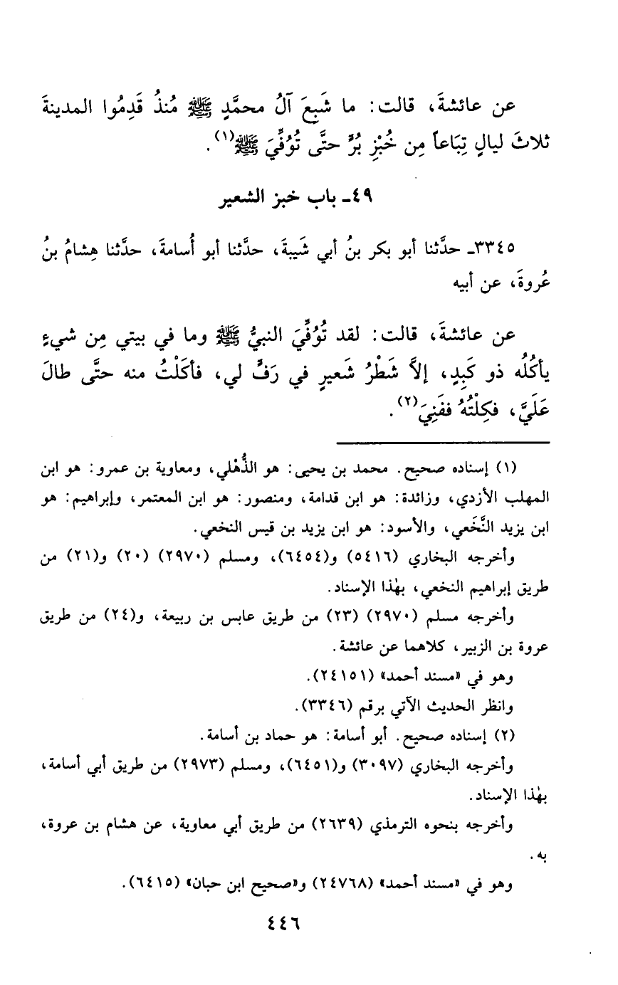 3345- حَدَّثَنَا أَبُو بَكْرِ بْنُ أَبِي شَيْبَةَ ، حَدَّثَنَا أَبُو أُسَامَةَ ، حَدَّثَنَا هِشَامُ بْنُ عُرْوَةَ ، عَنْ أَبِيهِ ، عَنْ عَائِشَةَ ، قَالَتْ : لَقَدْ تُوُفِّيَ النَّبِيُّ صَلَّى الله عَليْهِ وسَلَّمَ ، وَمَا فِي بَيْتِي مِنْ شَيْءٍ ، يَأْكُلُهُ ذُو كَبِدٍ ، إِلاَّ شَطْرُ شَعِيرٍ ، فِي رَفٍّ لِي ، فَأَكَلْتُ مِنْهُ ، حَتَّى طَالَ عَلَيَّ ، فَكِلْتُهُ فَفَنِيَ.