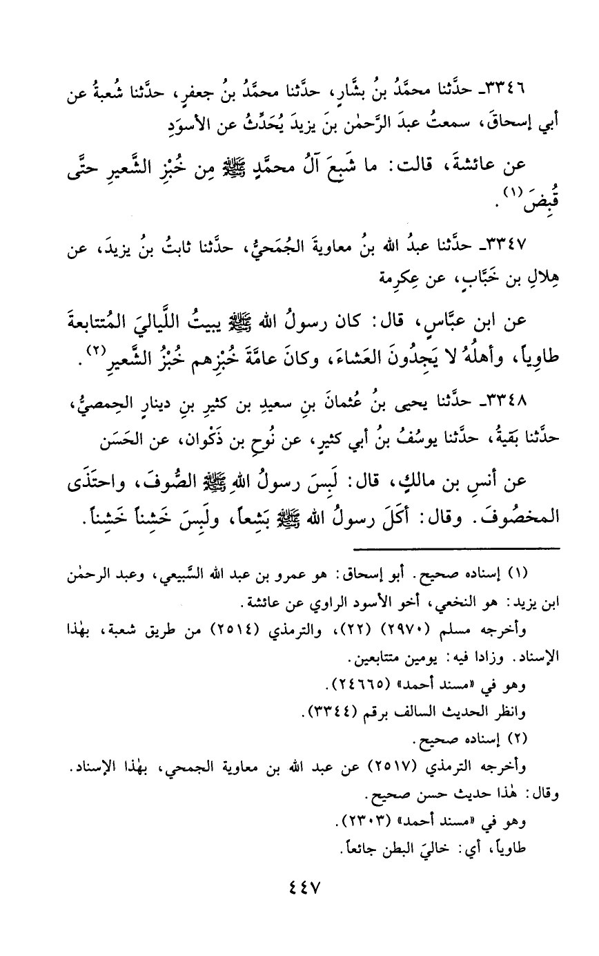 3346- حَدَّثَنَا مُحَمَّدُ بْنُ بَشَّارٍ ، حَدَّثَنَا مُحَمَّدُ بْنُ جَعْفَرٍ ، حَدَّثَنَا شُعْبَةُ ، عَنْ أَبِي إِسْحَاقَ ، سَمِعْتُ عَبْدَ الرَّحْمَنِ بْنَ يَزِيدَ ، يُحَدِّثُ عَنِ الأَسْوَدِ ، عَنْ عَائِشَةَ ، قَالَتْ : مَا شَبِعَ آلُ مُحَمَّدٍ صَلَّى الله عَليْهِ وسَلَّمَ ، مِنْ خُبْزِ الشَّعِيرِ ، حَتَّى قُبِضَ.