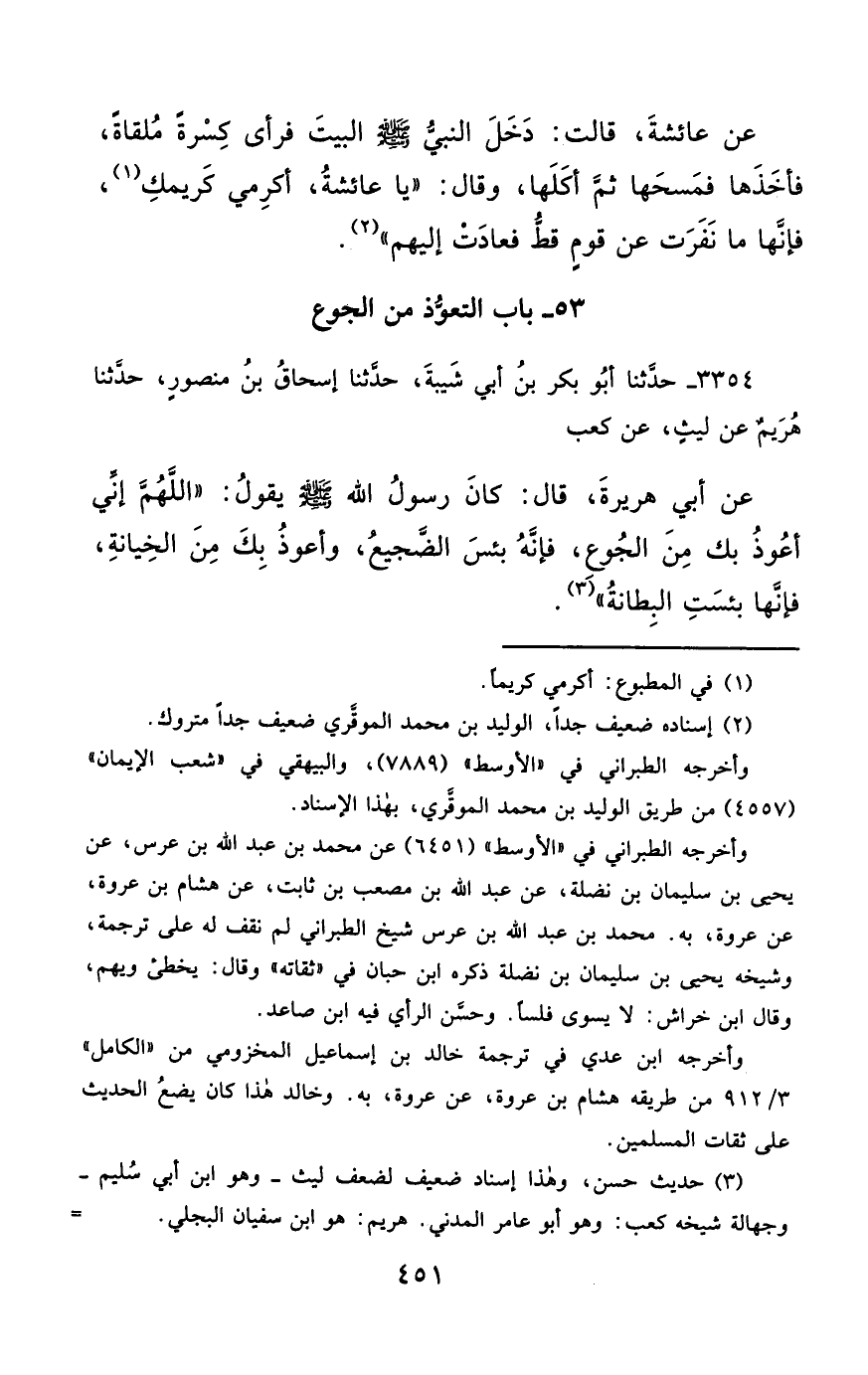 3354- حَدَّثَنَا أَبُو بَكْرِ بْنُ أَبِي شَيْبَةَ ، حَدَّثَنَا إِسْحَاقُ بْنُ مَنْصُورٍ ، حَدَّثَنَا هُرَيْمٌ ، عَنْ لَيْثٍ ، عَنْ كَعْبٍ ، عَنْ أَبِي هُرَيْرَةَ ، قَالَ : كَانَ رَسُولُ اللهِ صَلَّى الله عَليْهِ وسَلَّمَ يَقُولُ : اللَّهُمَّ إِنِّي أَعُوذُ بِكَ مِنَ الْجُوعِ ، فَإِنَّهُ بِئْسَ الضَّجِيعُ ، وَأَعُوذُ بِكَ مِنَ الْخِيَانَةِ ، فَإِنَّهَا بِئْسَتِ الْبِطَانَةُ.