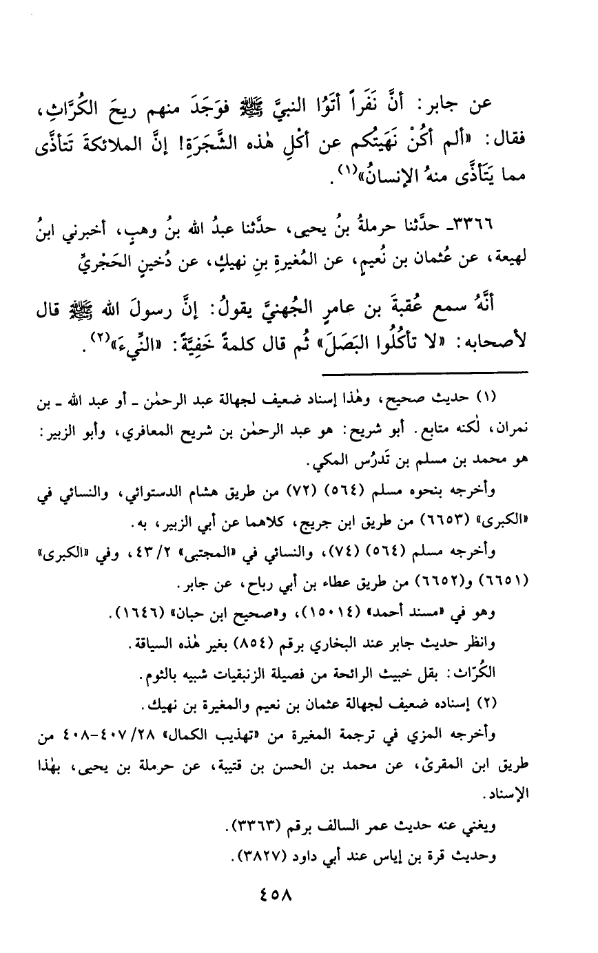 3366- حَدَّثَنَا حَرْمَلَةُ بْنُ يُحْيَى ، حَدَّثَنَا عَبْدُ اللهِ بْنُ وَهْبٍ ، أَخْبَرَنِي ابْنُ لَهِيعَةَ ، عَنْ عُثْمَانَ بْنِ نُعَيْمٍ ، عَنِ الْمُغِيرَةِ بْنِ نَهِيكٍ ، عَنْ دُخَيْنٍ الْحَجْرِيِّ ، أَنَّهُ سَمِعَ عُقْبَةَ بْنَ عَامِرٍ الْجُهَنِيَّ ، يَقُولُ : إِنَّ رَسُولَ اللهِ صَلَّى الله عَليْهِ وسَلَّمَ قَالَ لأَصْحَابِهِ : لاَ تَأْكُلُوا الْبَصَلَ ثُمَّ قَالَ : كَلِمَةً خَفِيَّةً النِّيءَ.