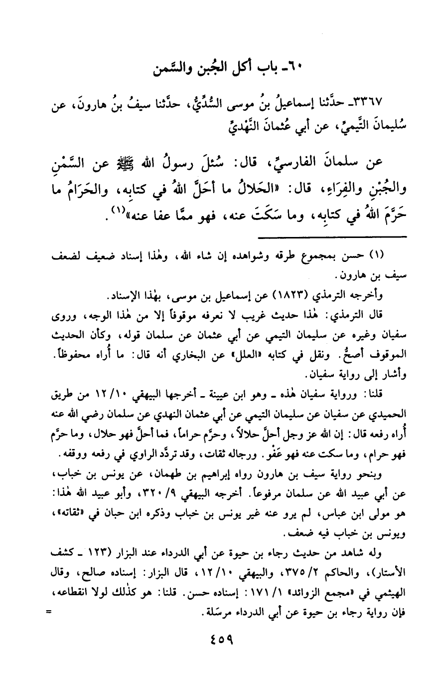 3367- حَدَّثَنَا إِسْمَاعِيلُ بْنُ مُوسَى السُّدِّيُّ ، حَدَّثَنَا سَيْفُ بْنُ هَارُونَ ، عَنْ سُلَيْمَانَ التَّيْمِيِّ ، عَنْ أَبِي عُثْمَانَ النَّهْدِيِّ ، عَنْ سَلْمَانَ الْفَارِسِيِّ ، قَالَ : سُئِلَ رَسُولُ اللهِ صَلَّى الله عَليْهِ وسَلَّمَ عَنِ السَّمْنِ ، وَالْجُبْنِ ، وَالْفِرَاءِ قَالَ : الْحَلاَلُ مَا أَحَلَّ اللَّهُ فِي كِتَابِهِ ، وَالْحَرَامُ مَا حَرَّمَ اللَّهُ فِي كِتَابِهِ ، وَمَا سَكَتَ عَنْهُ ، فَهُوَ مِمَّا عَفَا عَنْهُ.