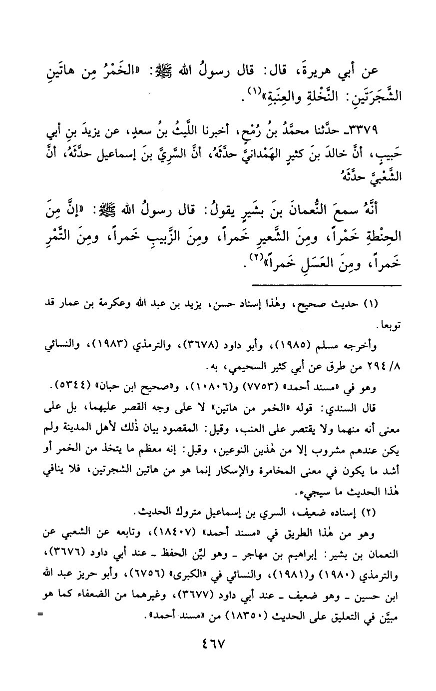 3379- حَدَّثَنَا مُحَمَّدُ بْنُ رُمْحٍ ، أَخْبَرَنَا اللَّيْثُ بْنُ سَعْدٍ ، عَنْ يَزِيدَ بْنِ أَبِي حَبِيبٍ ، أَنَّ خَالِدَ بْنَ كَثِيرٍ الْهَمْدَانِيَّ ، حَدَّثَهُ أَنَّ السَّرِيَّ بْنَ إِسْمَاعِيلَ ، حَدَّثَهُ أَنَّ الشَّعْبِيَّ ، حَدَّثَهُ أَنَّهُ سَمِعَ النُّعْمَانَ بْنَ بَشِيرٍ ، يَقُولُ : قَالَ رَسُولُ اللهِ صَلَّى الله عَليْهِ وسَلَّمَ : إِنَّ مِنَ الْحِنْطَةِ خَمْرًا ، وَمِنَ الشَّعِيرِ خَمْرًا ، وَمِنَ الزَّبِيبِ خَمْرًا ، وَمِنَ التَّمْرِ خَمْرًا ، وَمِنَ الْعَسَلِ خَمْرًا.