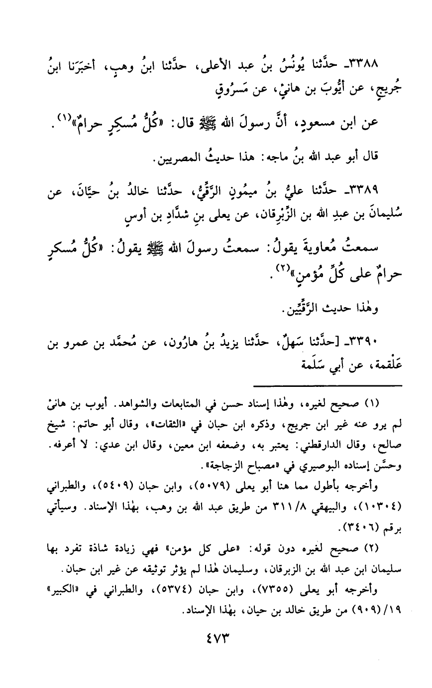 3388- حَدَّثَنَا يُونُسُ بْنُ عَبْدِ الأَعْلَى ، حَدَّثَنَا ابْنُ وَهْبٍ ، أَخْبَرَنَا ابْنُ جُرَيْجٍ ، عَنْ أَيُّوبَ بْنِ هَانِئٍ ، عَنْ مَسْرُوقٍ ، عَنِ ابْنِ مَسْعُودٍ ، أَنَّ رَسُولَ اللهِ صَلَّى الله عَليْهِ وسَلَّمَ قَالَ : كُلُّ مُسْكِرٍ ، حَرَامٌ.