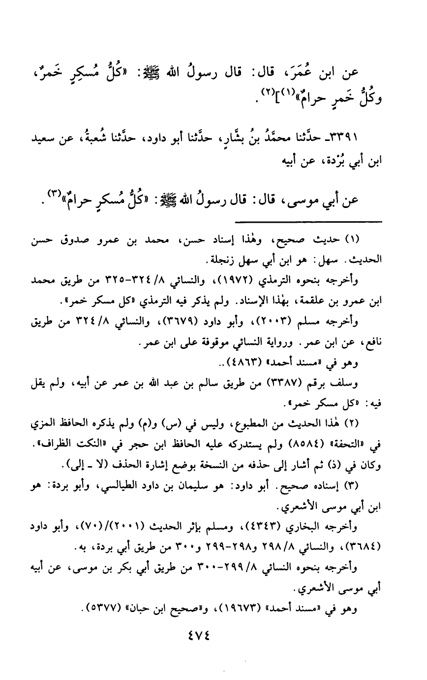 3391- حَدَّثَنَا مُحَمَّدُ بْنُ بَشَّارٍ ، حَدَّثَنَا أَبُو دَاوُدَ ، حَدَّثَنَا شُعْبَةُ ، عَنْ سَعِيدِ بْنِ أَبِي بُرْدَةَ ، عَنْ أَبِيهِ ، عَنْ أَبِي مُوسَى ، قَالَ : قَالَ رَسُولُ اللهِ صَلَّى الله عَليْهِ وسَلَّمَ : كُلُّ مُسْكِرٍ ، حَرَامٌ.