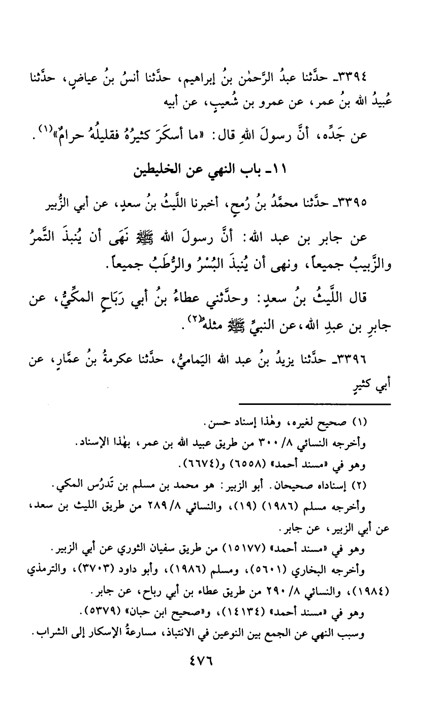 3395- حَدَّثَنَا مُحَمَّدُ بْنُ رُمْحٍ ، أَخْبَرَنَا اللَّيْثُ بْنُ سَعْدٍ ، عَنْ أَبِي الزُّبَيْرِ ، عَنْ جَابِرِ بْنِ عَبْدِ اللهِ ، أَنَّ رَسُولَ اللهِ صَلَّى الله عَليْهِ وسَلَّمَ : نَهَى أَنْ يُنْبَذَ التَّمْرُ ، وَالزَّبِيبُ جَمِيعًا ، وَنَهَى أَنْ يُنْبَذَ الْبُسْرُ ، وَالرُّطَبُ جَمِيعًا.