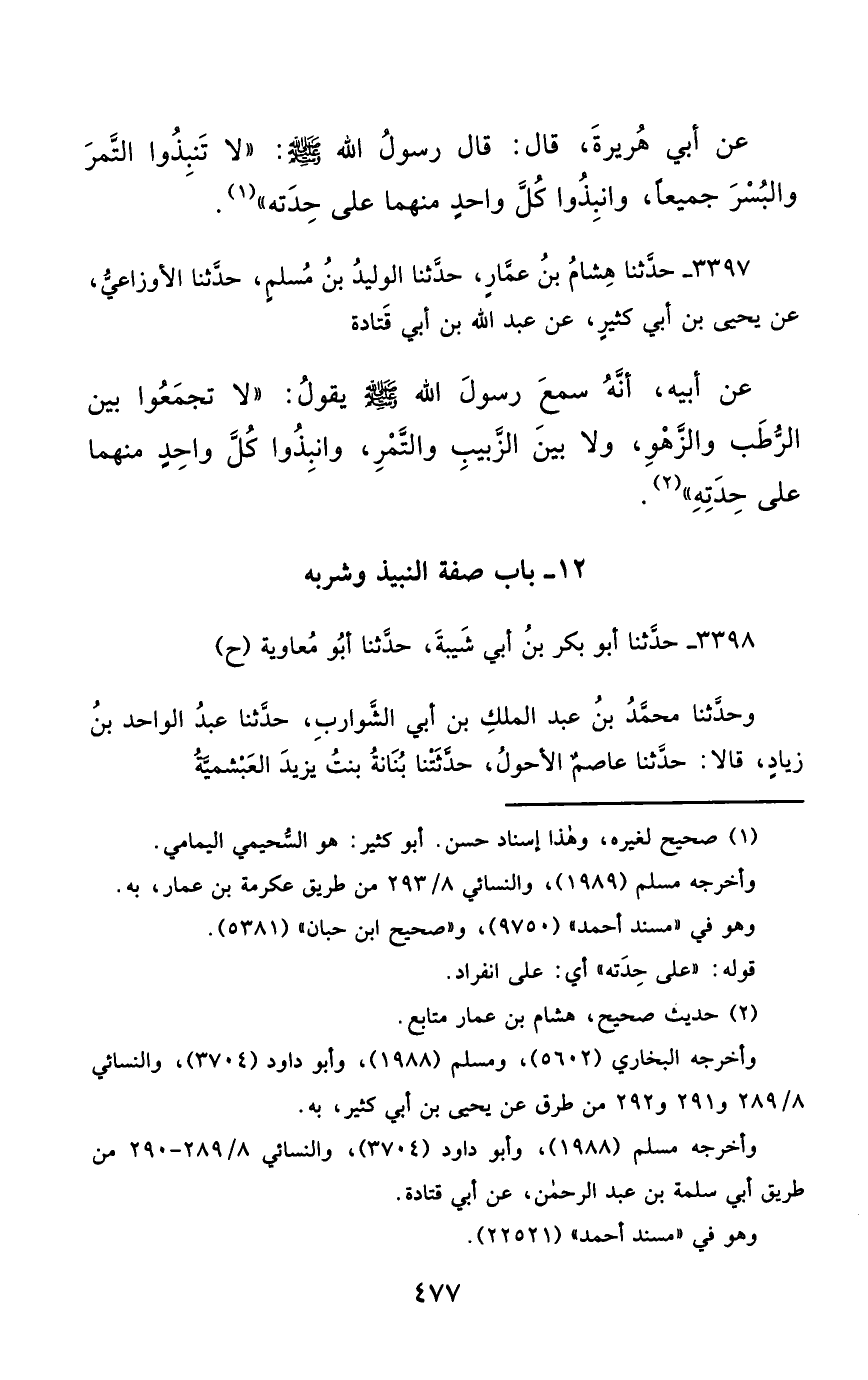 3397- حَدَّثَنَا هِشَامُ بْنُ عَمَّارٍ ، حَدَّثَنَا الْوَلِيدُ بْنُ مُسْلِمٍ ، حَدَّثَنَا الأَوْزَاعِيُّ ، عَنْ يَحْيَى بْنِ أَبِي كَثِيرٍ ، عَنْ عَبْدِ اللهِ بْنِ أَبِي قَتَادَةَ ، عَنْ أَبِيهِ ، أَنَّهُ سَمِعَ رَسُولَ اللهِ صَلَّى الله عَليْهِ وسَلَّمَ يَقُولُ : لاَ تَجْمَعُوا بَيْنَ الرُّطَبِ ، وَالزَّهْوِ ، وَلاَ بَيْنَ الزَّبِيبِ ، وَالتَّمْرِ ، وَانْبِذُوا كُلَّ وَاحِدٍ مِنْهُمَا عَلَى حِدَتِهِ.