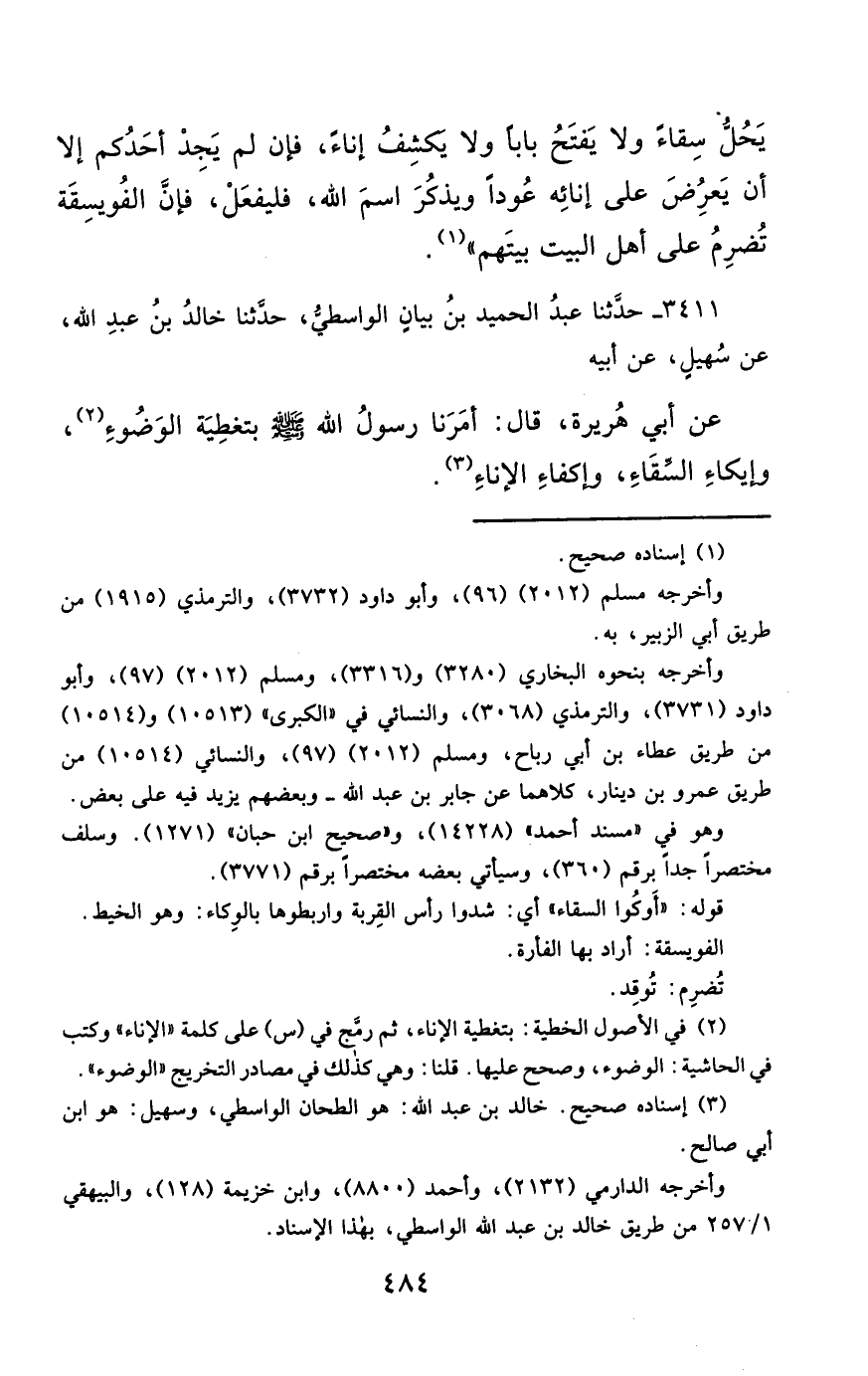 3411- حَدَّثَنَا عَبْدُ الْحَمِيدِ بْنُ بَيَانٍ الْوَاسِطِيُّ ، حَدَّثَنَا خَالِدُ بْنُ عَبْدِ اللهِ ، عَنْ سُهَيْلٍ ، عَنْ أَبِيهِ ، عَنْ أَبِي هُرَيْرَةَ ، قَالَ : أَمَرَنَا رَسُولُ اللهِ صَلَّى الله عَليْهِ وسَلَّمَ ، بِتَغْطِيَةِ الإِنَاءِ ، وَإِيكَاءِ السِّقَاءِ ، وَإِكْفَاءِ الإِنَاءِ.