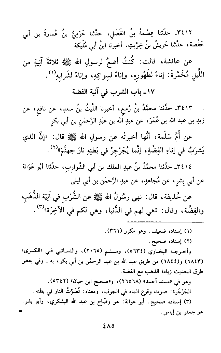 3413- حَدَّثَنَا مُحَمَّدُ بْنُ رُمْحٍ ، أَخْبَرَنَا اللَّيْثُ بْنُ سَعْدٍ ، عَنْ نَافِعٍ ، عَنْ زَيْدِ بْنِ عَبْدِ اللهِ بْنِ عُمَرَ ، عَنْ عَبْدِ اللهِ بْنِ عَبْدِ الرَّحْمَنِ بْنِ أَبِي بَكْرٍ ، عَنْ أُمِّ سَلَمَةَ ، أَنَّهَا أَخْبَرَتْهُ عَنْ رَسُولِ اللهِ صَلَّى الله عَليْهِ وسَلَّمَ قَالَ : إِنَّ الَّذِي يَشْرَبُ فِي إِنَاءِ الْفِضَّةِ ، إِنَّمَا يُجَرْجِرُ فِي بَطْنِهِ ، نَارَ جَهَنَّمَ.