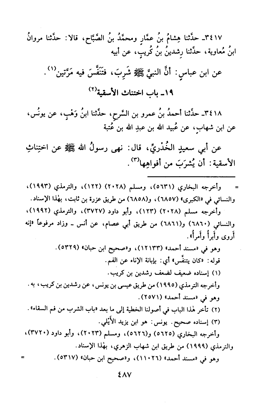 3417- حَدَّثَنَا هِشَامُ بْنُ عَمَّارٍ ، وَمُحَمَّدُ بْنُ الصَّبَّاحِ ، قَالاَ : حَدَّثَنَا مَرْوَانُ بْنُ مُعَاوِيَةَ ، حَدَّثَنَا رِشْدِينُ بْنُ كُرَيْبٍ ، عَنْ أَبِيهِ ، عَنِ ابْنِ عَبَّاسٍ : أَنَّ النَّبِيَّ صَلَّى الله عَليْهِ وسَلَّمَ : شَرِبَ ، فَتَنَفَّسَ فِيهِ مَرَّتَيْنِ.