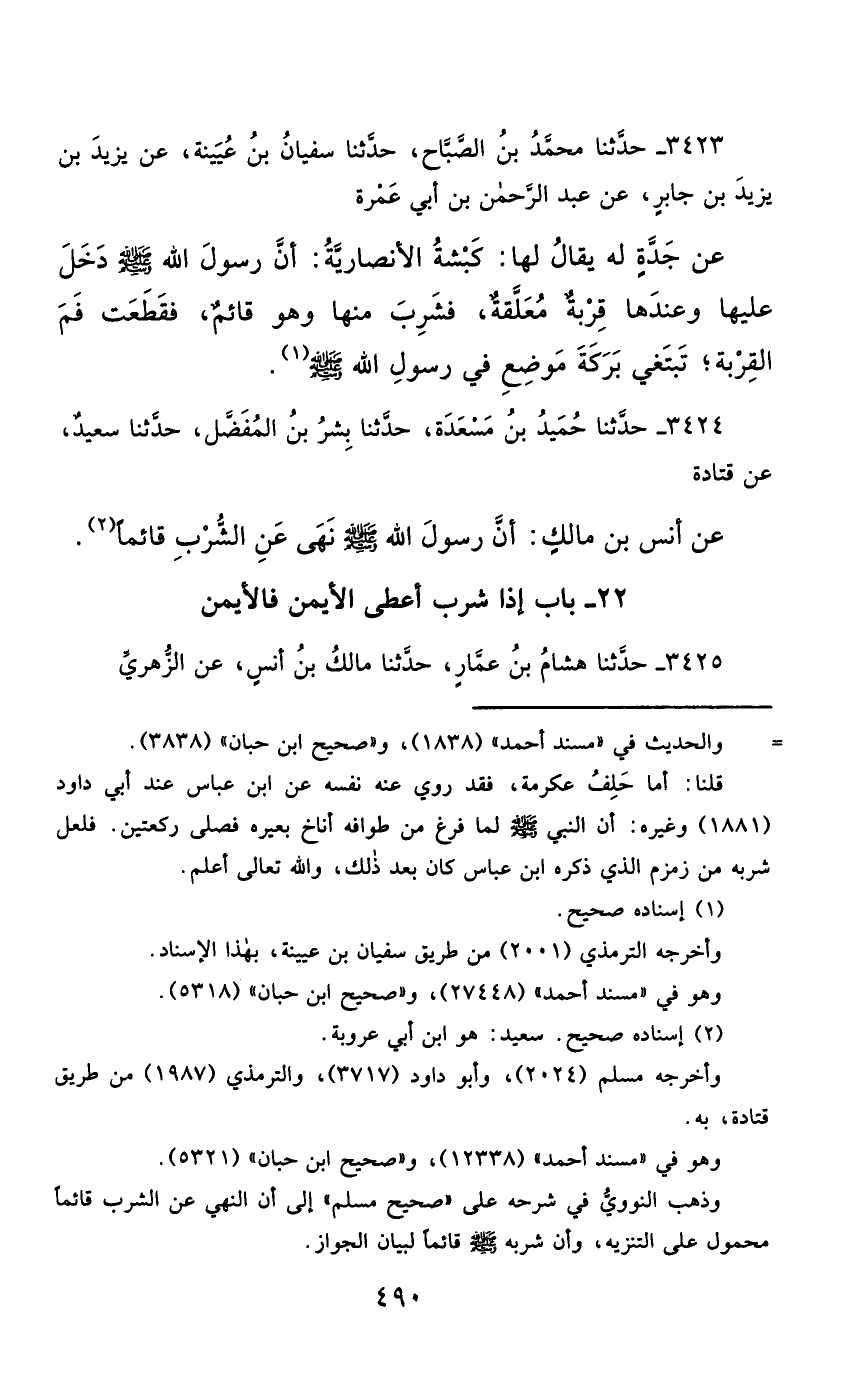 3423- حَدَّثَنَا مُحَمَّدُ بْنُ الصَّبَّاحِ ، أَخْبَرَنَا سُفْيَانُ بْنُ عُيَيْنَةَ ، عَنْ يَزِيدَ بْنِ يَزِيدَ بْنِ جَابِرٍ ، عَنْ عَبْدِ الرَّحْمَنِ بْنِ أَبِي عَمْرَةَ ، عَنْ جَدَّةٍ لَهُ يُقَالُ لَهَا كَبْشَةُ الأَنْصَارِيَّةُ ، أَنَّ رَسُولَ اللهِ صَلَّى الله عَليْهِ وسَلَّمَ : دَخَلَ عَلَيْهَا ، وَعِنْدَهَا قِرْبَةٌ مُعَلَّقَةٌ ، فَشَرِبَ مِنْهَا ، وَهُوَ قَائِمٌ ، فَقَطَعَتْ فَمَ الْقِرْبَةِ تَبْتَغِي بَرَكَةَ ، مَوْضِعِ فِي رَسُولِ اللهِ صَلَّى الله عَليْهِ وسَلَّمَ.