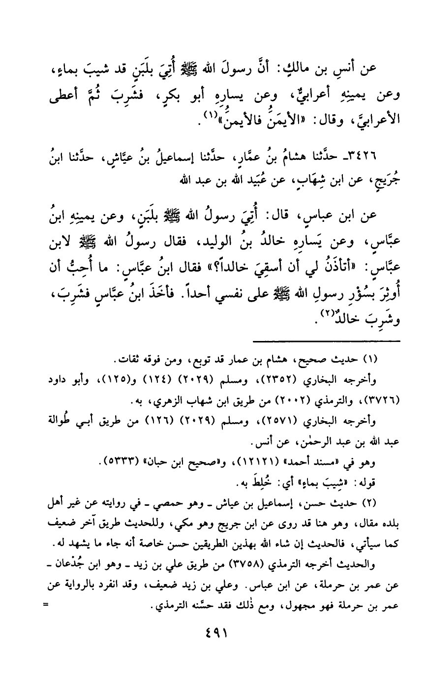 3426- حَدَّثَنَا هِشَامُ بْنُ عَمَّارٍ ، حَدَّثَنَا إِسْمَاعِيلُ بْنُ عَيَّاشٍ ، حَدَّثَنَا ابْنُ جُرَيْجٍ ، عَنِ ابْنِ شِهَابٍ ، عَنْ عُبَيْدِ اللهِ بْنِ عَبْدِ اللهِ ، عَنِ ابْنِ عَبَّاسٍ ، قَالَ : أُتِيَ رَسُولُ اللهِ صَلَّى الله عَليْهِ وسَلَّمَ ، بِلَبَنٍ ، وَعَنْ يَمِينِهِ ابْنُ عَبَّاسٍ ، وَعَنْ يَسَارِهِ خَالِدُ بْنُ الْوَلِيدِ ، فَقَالَ رَسُولُ اللهِ صَلَّى الله عَليْهِ وسَلَّمَ لاِبْنِ عَبَّاسٍ : أَتَأْذَنُ لِي أَنْ أَسْقِيَ خَالِدًا قَالَ ابْنُ عَبَّاسٍ : مَا أُحِبُّ أَنْ أُوثِرَ ، بِسُؤْرِ رَسُولِ اللهِ صَلَّى الله عَليْهِ وسَلَّمَ ، عَلَى نَفْسِي أَحَدًا ، فَأَخَذَ ابْنُ عَبَّاسٍ ، فَشَرِبَ ، وَشَرِبَ خَالِدٌ.