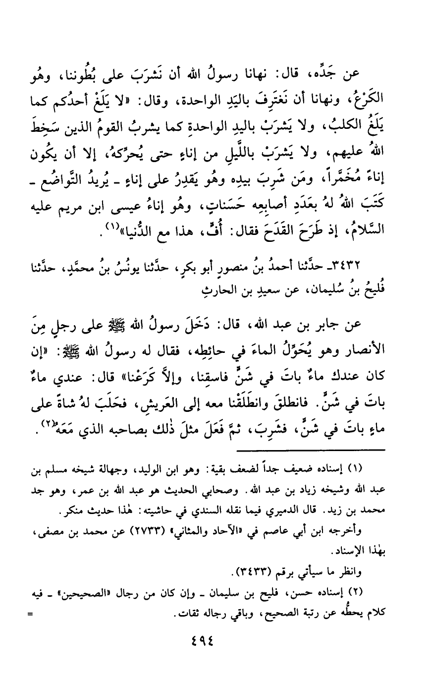 3432- حَدَّثَنَا أَحْمَدُ بْنُ مَنْصُورٍ أَبُو بَكْرٍ ، حَدَّثَنَا يُونُسُ بْنُ مُحَمَّدٍ ، حَدَّثَنَا فُلَيْحُ بْنُ سُلَيْمَانَ ، عَنْ سَعِيدِ بْنِ الْحَارِثِ ، عَنْ جَابِرِ بْنِ عَبْدِ اللهِ ، قَالَ : دَخَلَ رَسُولُ اللهِ صَلَّى الله عَليْهِ وسَلَّمَ ، عَلَى رَجُلٍ مِنَ الأَنْصَارِ ، وَهُوَ يُحَوِّلُ الْمَاءَ فِي حَائِطِهِ ، فَقَالَ لَهُ رَسُولُ اللهِ صَلَّى الله عَليْهِ وسَلَّمَ : إِنْ كَانَ عِنْدَكَ مَاءٌ بَاتَ فِي شَنٍّ فَاسْقِنَا ، وَإِلاَّ كَرَعْنَا قَالَ : عِنْدِي مَاءٌ بَاتَ فِي شَنٍّ ، فَانْطَلَقَ ، وَانْطَلَقْنَا مَعَهُ ، إِلَى الْعَرِيشِ ، فَحَلَبَ لَهُ شَاةً ، عَلَى مَاءٍ بَاتَ فِي شَنٍّ فَشَرِبَ ، ثُمَّ فَعَلَ مِثْلَ ذَلِكَ بِصَاحِبِهِ الَّذِي مَعَهُ.