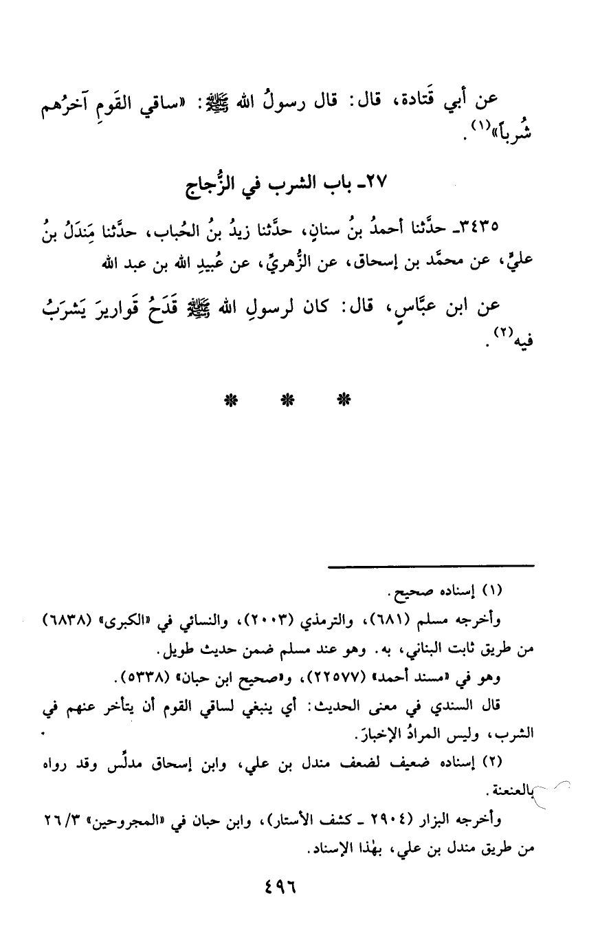 3435- حَدَّثَنَا أَحْمَدُ بْنُ سِنَانٍ ، حَدَّثَنَا زَيْدُ بْنُ الْحُبَابِ ، حَدَّثَنَا مَنْدَلُ بْنُ عَلِيٍّ ، عَنْ مُحَمَّدِ بْنِ إِسْحَاقَ ، عَنِ الزُّهْرِيِّ ، عَنْ عُبَيْدِ اللهِ بْنِ عَبْدِ اللهِ ، عَنِ ابْنِ عَبَّاسٍ ، قَالَ : كَانَ لِرَسُولِ اللهِ صَلَّى الله عَليْهِ وسَلَّمَ ، قَدَحُ قَوَارِيرَ يَشْرَبُ فِيهِ.