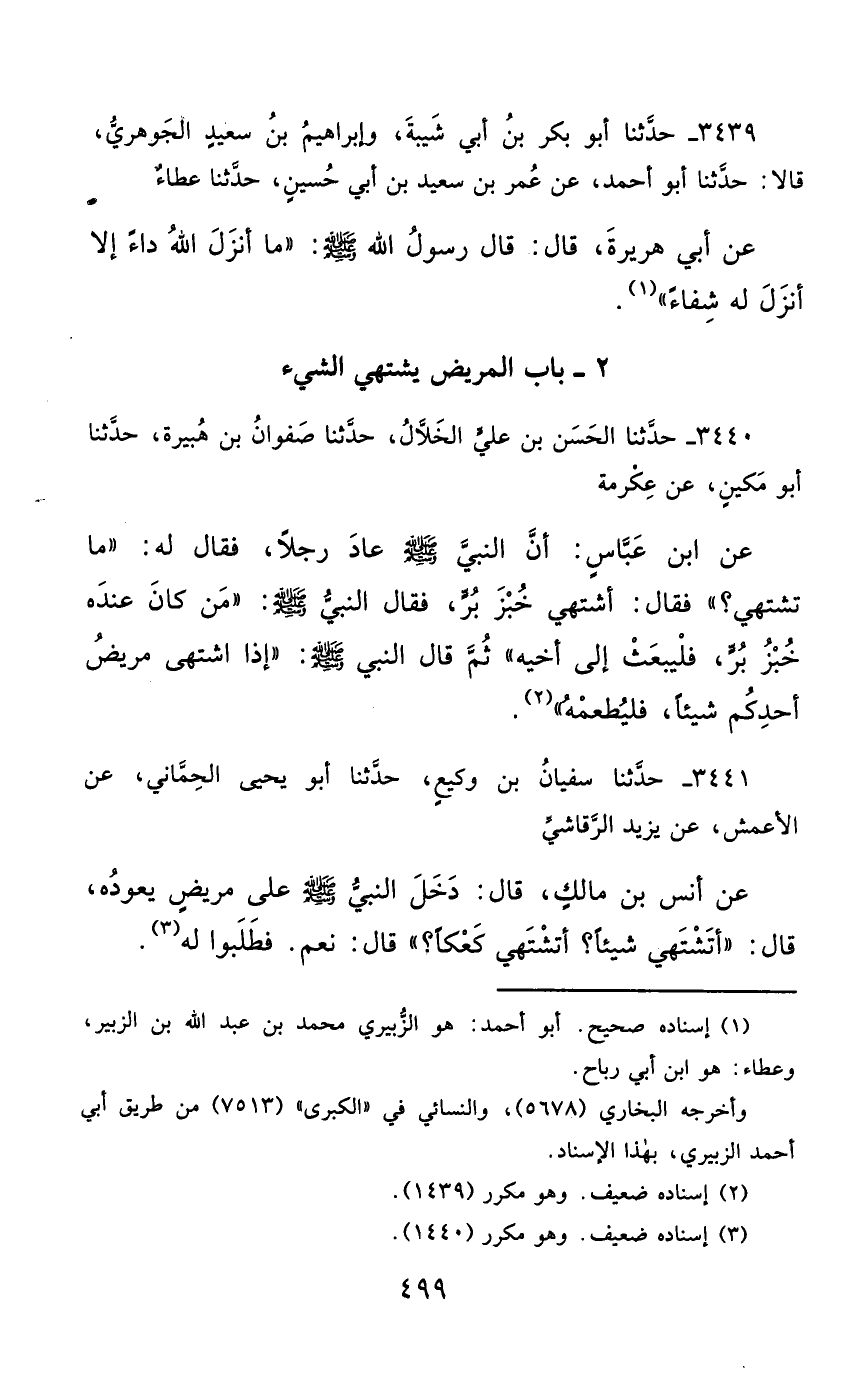 3441- حَدَّثَنَا سُفْيَانُ بْنُ وَكِيعٍ ، حَدَّثَنَا أَبُو يَحْيَى الْحِمَّانِيُّ ، عَنِ الأَعْمَشِ ، عَنْ يَزِيدَ الرَّقَاشِيِّ ، عَنْ أَنَسِ بْنِ مَالِكٍ ، قَالَ : دَخَلَ النَّبِيُّ صَلَّى الله عَليْهِ وسَلَّمَ ، عَلَى مَرِيضٍ يَعُودُهُ ، قَالَ : أَتَشْتَهِي شَيْئًا قَالَ : أَشْتَهِي كَعْكًا ، قَالَ : نَعَمْ فَطَلَبُوا لَهُ.